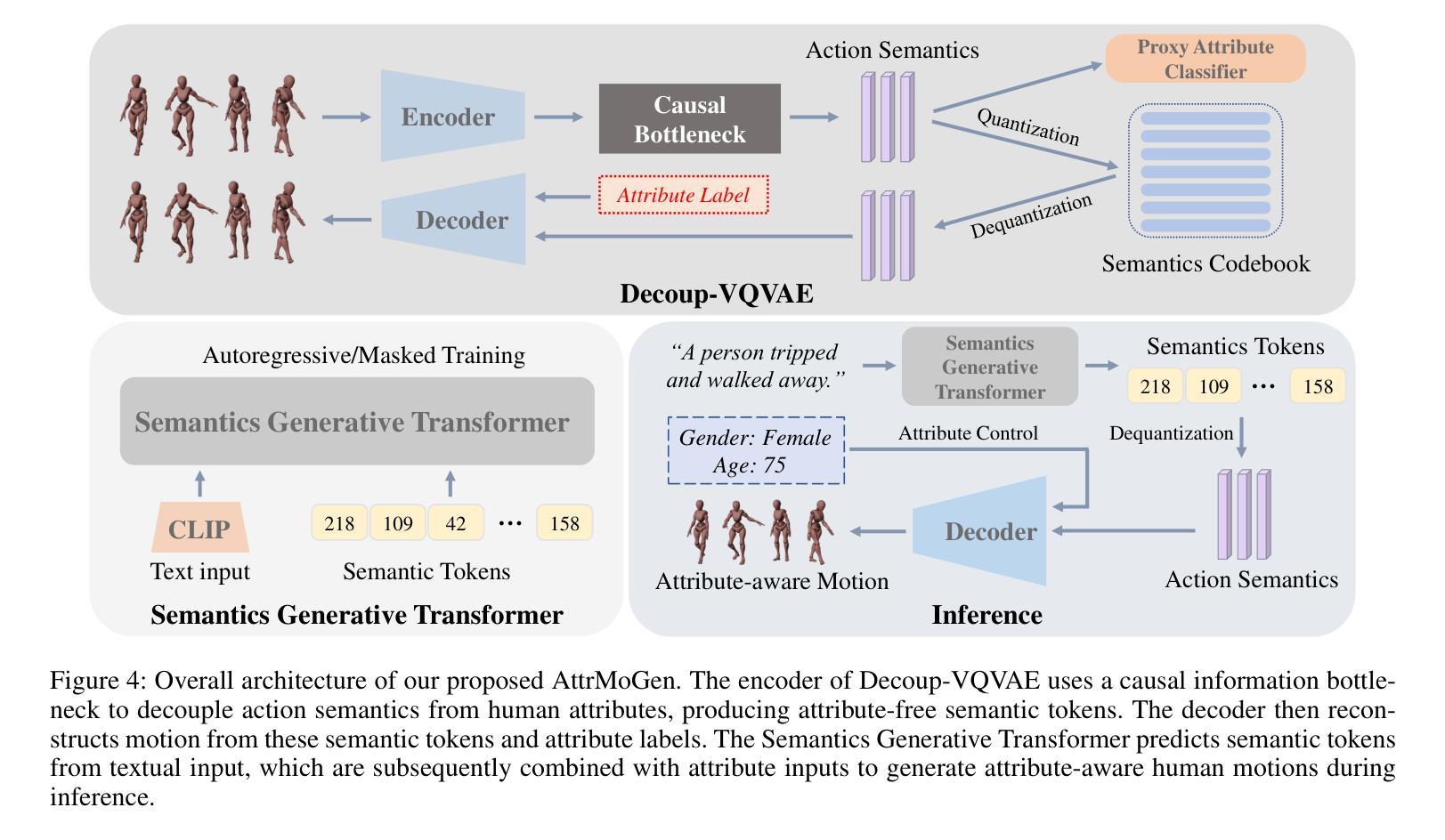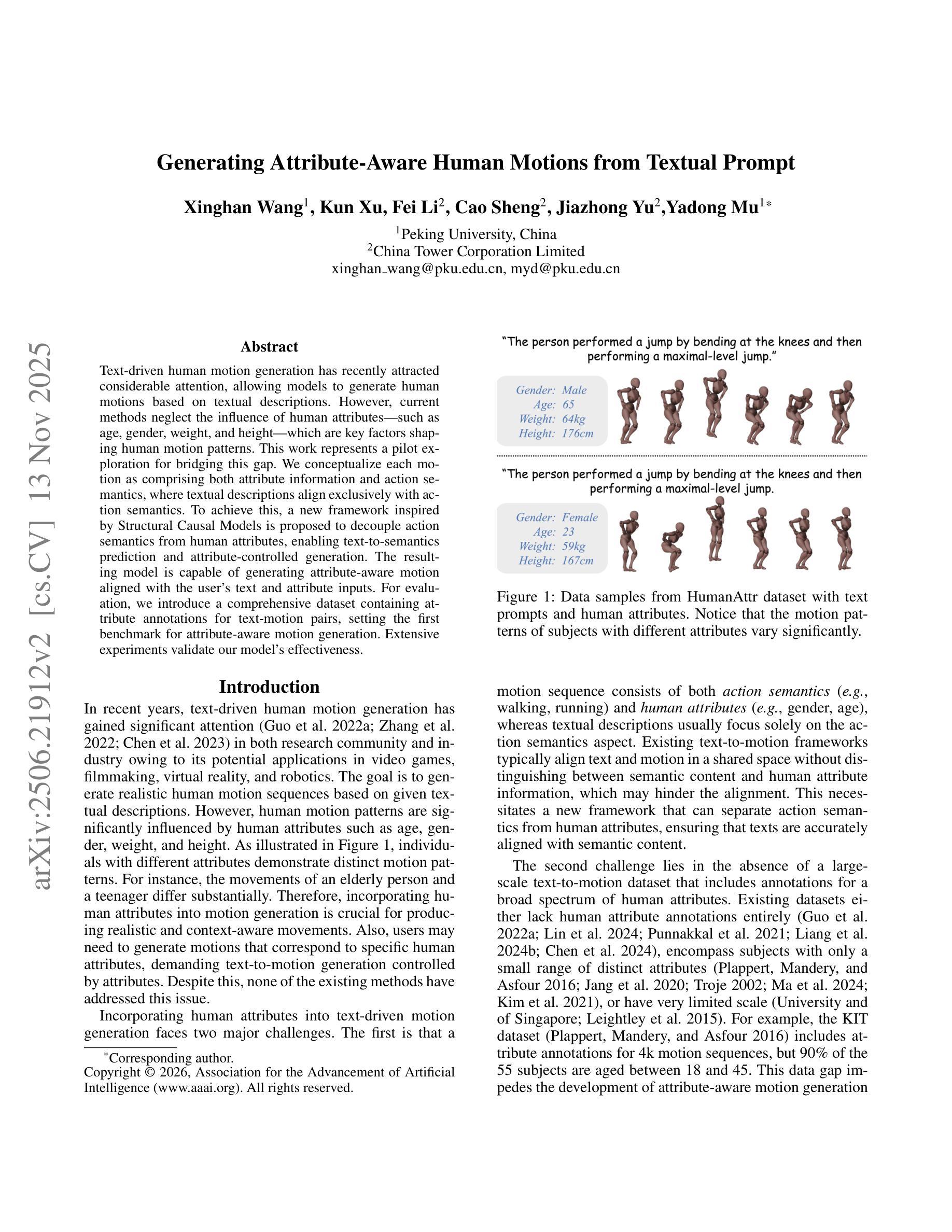 文本驱动的人类运动生成近期引起了广泛的关注,它允许模型基于文本描述生成人类运动。然而,当前的方法忽视了人类属性(如年龄、性别、体重和身高)的影响,这些属性是塑造人类运动模式的关键因素。这项工作是对缩小这一差距的初步探索。我们将每种运动概念化为属性信息和动作语义的组合,文本描述只与动作语义相对应。为实现这一点,受结构因果模型的启发,我们提出了一个新的框架,将动作语义与人类属性解耦,实现文本到语义的预测和属性控制生成。所得模型能够根据用户的文本和属性输入,生成与之相符的属性感知运动。为了评估,我们引入了一个综合数据集,其中包含文本与运动对属性的注解,为属性感知运动生成设置了第一个基准。大量实验验证了我们的模型的有效性。
