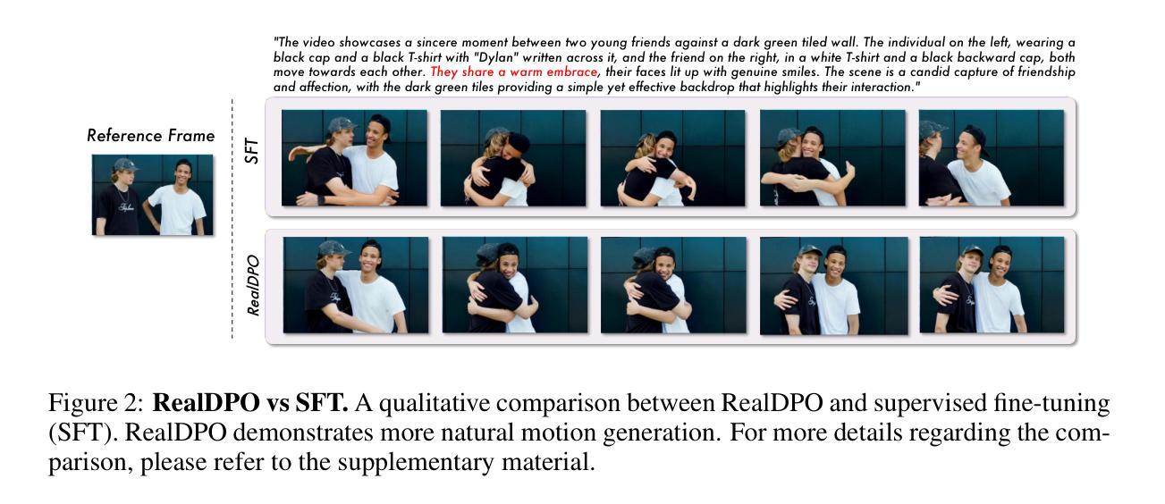 - RealDPO采用直接偏好优化(DPO)和定制损失函数,提供迭代自我修正,改进运动质量。