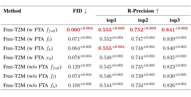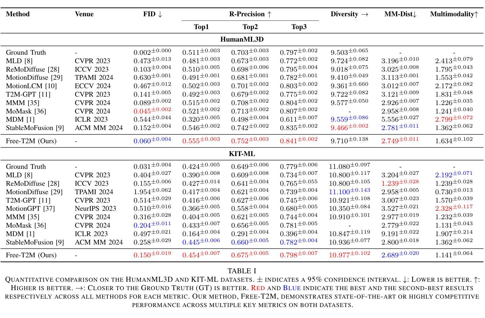 - 实验显示Free-T2M显著提高了运动质量和语义准确性,并建立了新的扩散架构内的最佳水平。