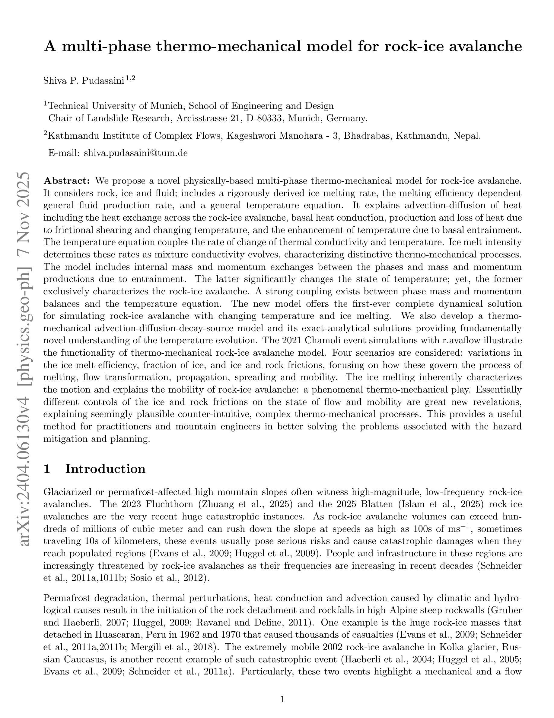 我们提出了一种新型的多阶段热机械岩冰崩模型。该模型考虑了岩石、冰和流体,包括严格推导的冰融化速率、依赖于融化效率的流体产生速率和一般的温度方程。它解释了热的对流-扩散,包括崩滑中的热交换、底部热传导、因摩擦剪切和温度变化产生的热量以及因夹带造成的温度增强。温度方程结合了热导率和温度的变化率。冰融化的强度决定了这些速率,随着混合物的热导率的变化而变化,表征了热机械过程。该模型包括界面质量和动量交换以及因夹带而产生的质量和动量生成。后者对温度状态有显著影响;然而,前者则代表了岩冰崩的特点。阶段质量、动量平衡和温度是相互关联的。新模型为具有可变温度的岩冰崩提供了首个完整的动力学解决方案。我们建立了一个对流-扩散-衰减-源模型及其解析解,为温度演变提供了新的理解。使用r.avaflow(https://www.landslidemodels.org/r.avaflow/)对2021年查莫利事件的模拟说明了热机械岩冰崩模型的功能。考虑了四种情景:冰融化效率的变化、冰的比例、冰和岩石的摩擦力以及控制融化、流动转化、扩散和移动的过程。冰的融化标志着运动,并解释了岩冰崩的移动能力:这是一个现象级的热机械过程。揭示了冰和岩石摩擦力对流动状态的不同控制,解释了复杂的热机械过程。这为从业人员和工程师解决与岩冰崩相关的问题提供了一种有用的方法。