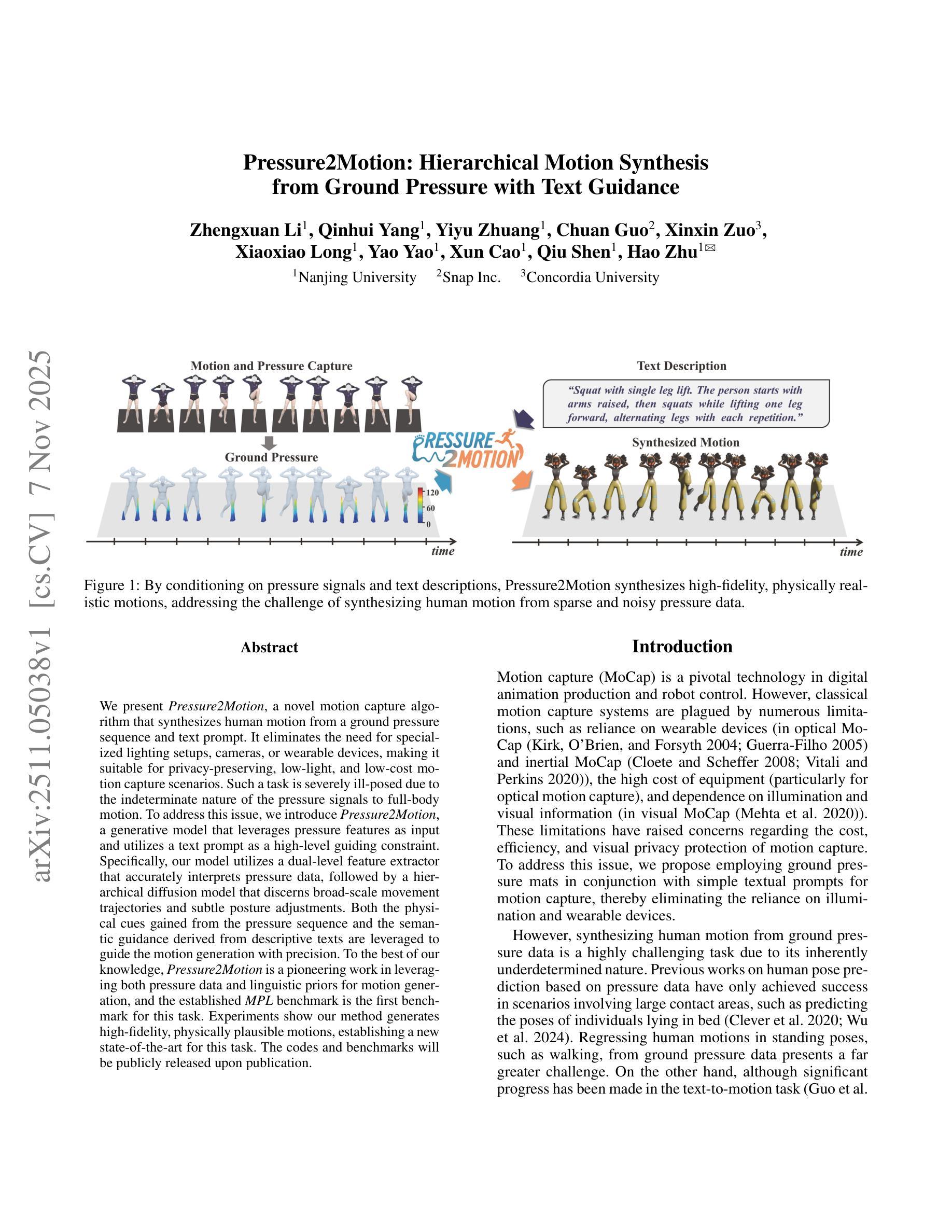 提出一种名为Pressure2Motion的新型运动捕捉算法,该算法可以从地面压力序列和文本提示中合成人类运动,无需特殊照明设置、相机或可穿戴设备。通过压力特征和文本提示的高级约束,该算法解决了压力信号与全身运动之间不确定性的问题。实验表明,该方法生成的运动具有高保真度和物理可行性,为该任务建立了新的技术标杆。