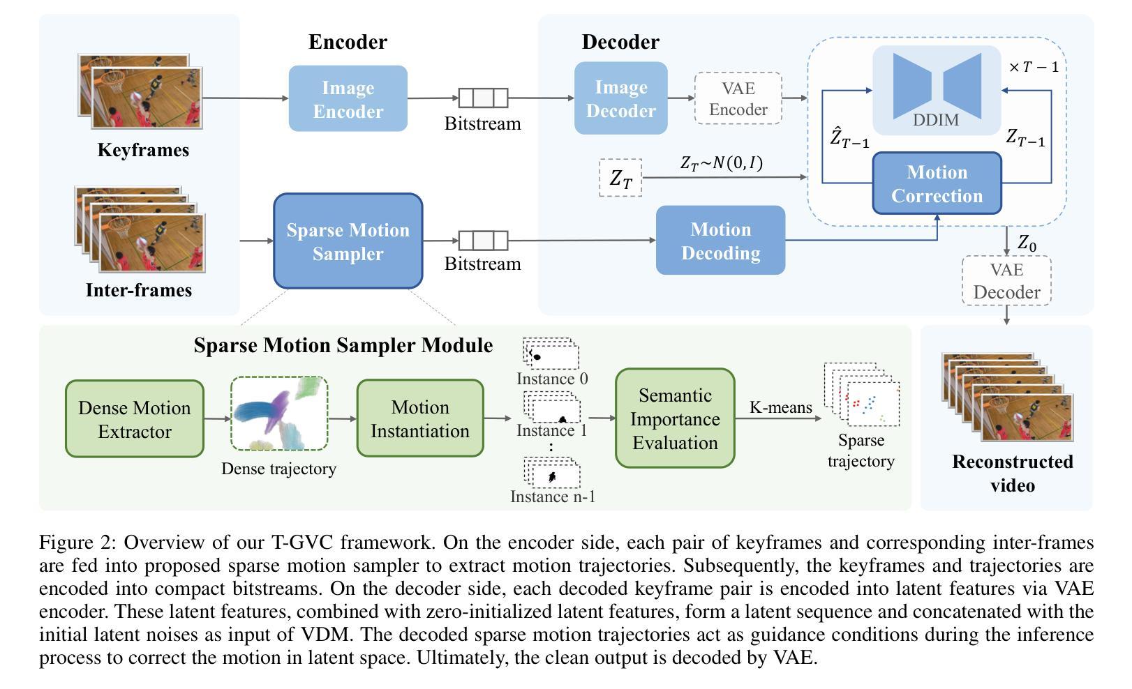 本文提出了轨迹引导生成式视频编码(T-GVC)框架,该框架结合低级别的运动跟踪与高级别的语义理解。它通过语义感知的稀疏运动采样管道,根据像素的语义重要性提取稀疏轨迹点,从而显著降低比特率同时保留关键的时间语义信息。此外,通过在扩散过程中引入轨迹对齐的损失约束,T-GVC在潜在空间中引入了一种无需训练的引导机制,确保物理上合理的运动模式,同时不牺牲生成模型的内生能力。实验结果表明,T-GVC在超低比特率条件下优于传统和神经网络视频编码方法。