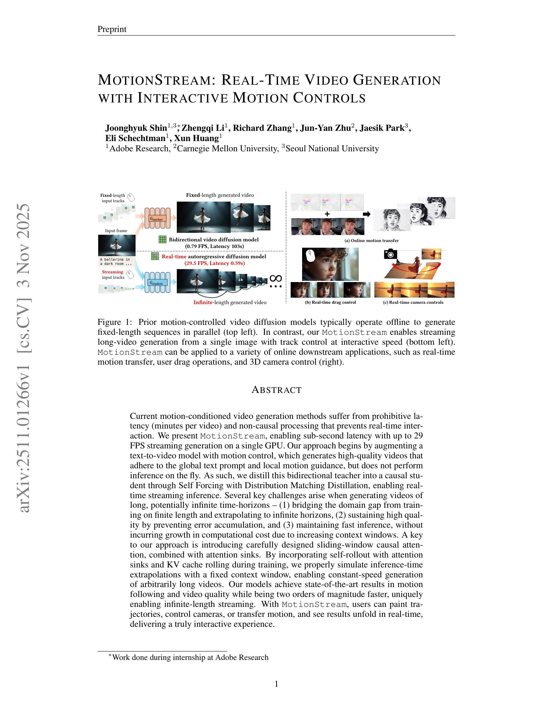 当前的运动条件视频生成方法存在延迟过长(每分钟生成一个视频)和非因果处理的问题,这阻碍了实时交互。我们提出了MotionStream,实现了每秒生成高达29帧的视频,并在单个GPU上进行流式生成,延迟缩短至不到一秒。我们的方法首先通过增强文本到视频模型的运动控制功能来生成高质量的视频,这些视频遵循全局文本提示和局部运动指导,但并不支持即时推理。因此,我们通过分布匹配蒸馏的自我强制将这种双向教师蒸馏为因果学生,从而实现实时流式推理。在生成长时间甚至无限时长视频时,面临以下关键挑战:1)从有限长度训练扩展到无限时长视频领域的差距;2)通过防止错误累积来维持高质量;3)在不断增加的上下文窗口的情况下,保持快速推理,避免计算成本的增加。我们的方法的关键在于引入精心设计滑动窗口因果注意力以及注意力池。通过结合训练时的注意力池和自我滚动KV缓存滚动,我们能够用固定的上下文窗口模拟推理时间的外推,实现了任意长度视频的恒定速度生成。我们的模型在运动跟踪和视频质量方面达到了最新水平,同时速度提高了两个数量级,能够唯一实现无限长度流式传输。使用MotionStream,用户可以在实时中绘制轨迹、控制相机或转换运动,并看到结果展开,实现真正的交互式体验。