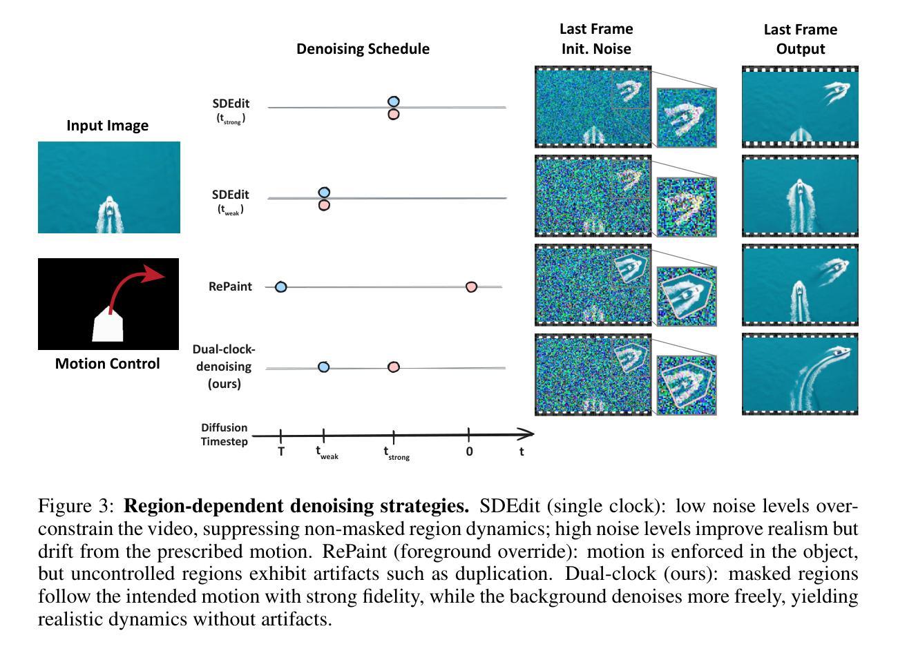 基于扩散的视频生成可以创建逼真的视频,但现有的图像和文字条件无法提供精确的运动控制。以前的方法对于运动条件下的合成通常需要针对特定模型进行微调,这既耗费计算资源又很受限。我们引入了Time-to-Move(TTM),这是一个无需训练的即插即用框架,使用图像到视频(I2V)扩散模型进行运动和外观控制的视频生成。我们的关键见解是使用通过用户友好的操作(如剪切和拖动或基于深度的重新投影)获得的粗略参考动画。受SDEdit使用粗略布局线索进行图像编辑的启发,我们将粗略动画视为粗略的运动线索并将其适应视频领域。我们保留图像条件的外貌,并引入双时钟去噪,这是一种区域依赖策略,在指定的运动区域强制严格对齐,而在其他地方则允许灵活性,平衡了符合用户意图的自然动态。采样过程的这种轻量级修改不会带来额外的训练或运行成本,并且与任何主干架构都兼容。在物体和相机运动基准测试上的大量实验表明,TTM在真实感和运动控制方面与现有的基于训练的方法相匹敌或更好。除此之外,TTM还引入了一项独特的能力:通过像素级条件进行精确的外观控制,突破了仅文本提示的局限性。有关视频示例和代码,请访问我们的项目页面:https://time-to-move.github.io/。