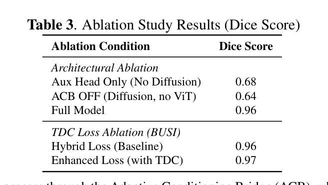 针对乳腺超声图像中的病灶分割难题,如低对比度、斑点噪声和边界不清等问题,提出一种结合增强型UNet生成解码器与Vision Transformer(ViT)编码器的灵活条件去噪扩散模型。模型引入三项创新技术,包括自适应条件桥(ACB)、拓扑去噪一致性(TDC)损失组件和双头架构,实现高效多尺度语义特征融合、结构不一致性的训练惩罚以及快速准确的小数据集推理。在公共乳腺超声数据集上取得最新成果,Dice得分达到领先水平。