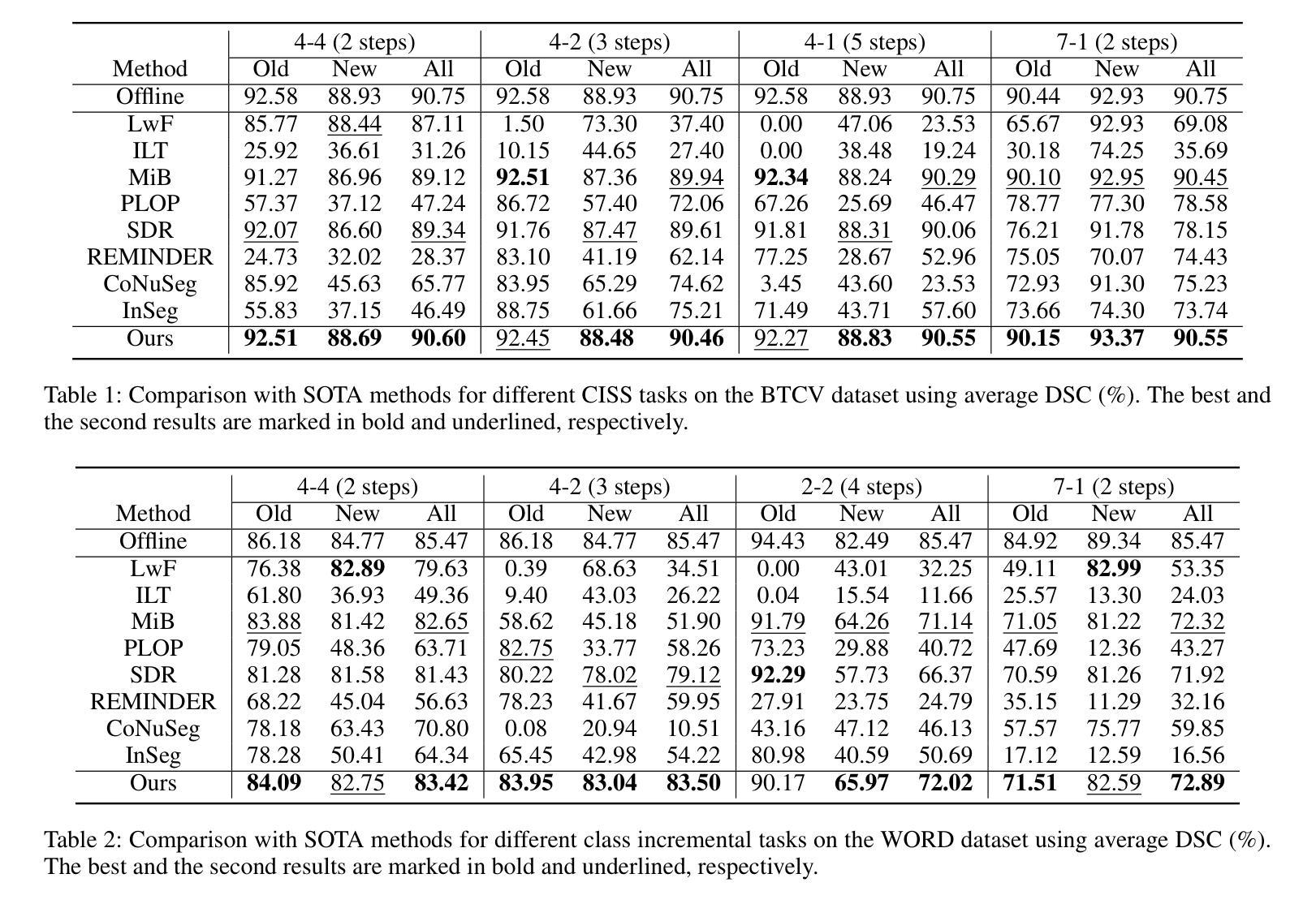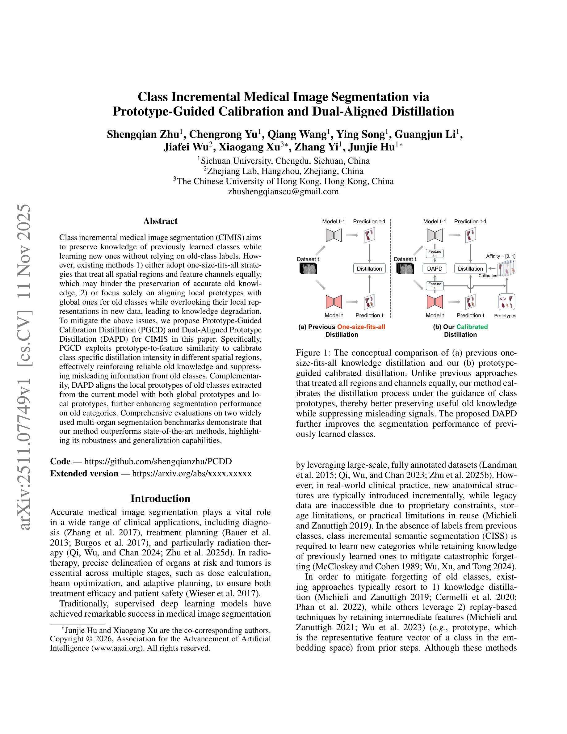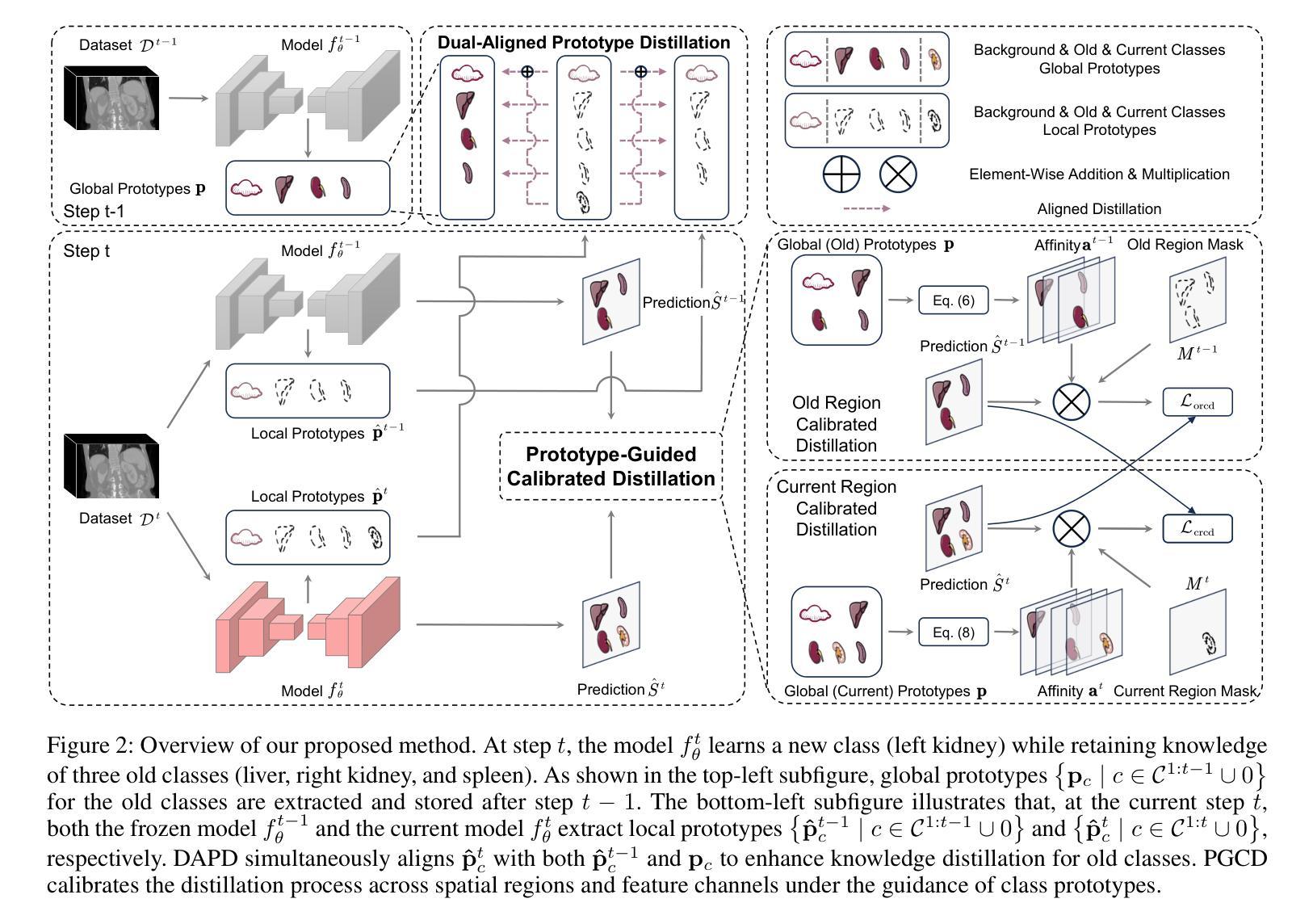 本文提出了针对医学图像分割中的类增量学习问题(CIMIS)的解决方案。针对现有方法的不足,本文提出了原型引导校准蒸馏(PGCD)和双对齐原型蒸馏(DAPD)。前者利用原型与特征之间的相似性,在不同空间区域校准类特定的蒸馏强度,强化旧知识并抑制误导信息。后者则对齐旧类的局部原型,进一步提高旧类别的分割性能。经多器官分割基准测试验证,该方法优于现有技术,表现出稳健性和泛化能力。