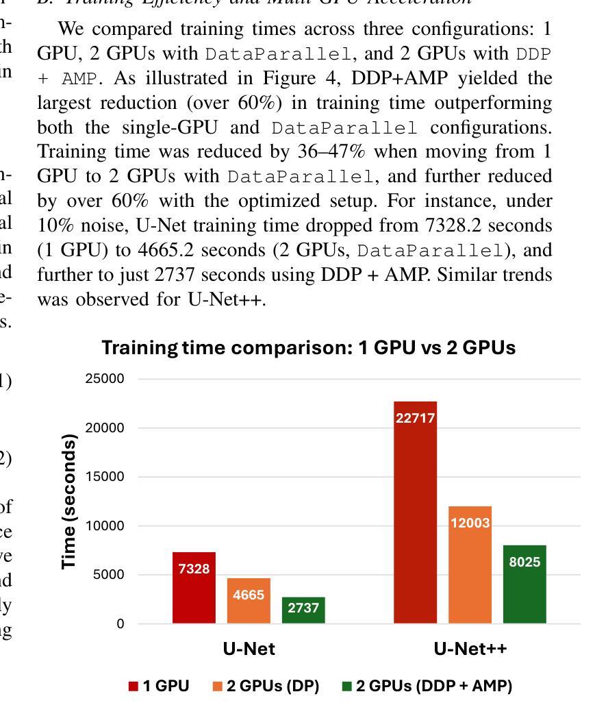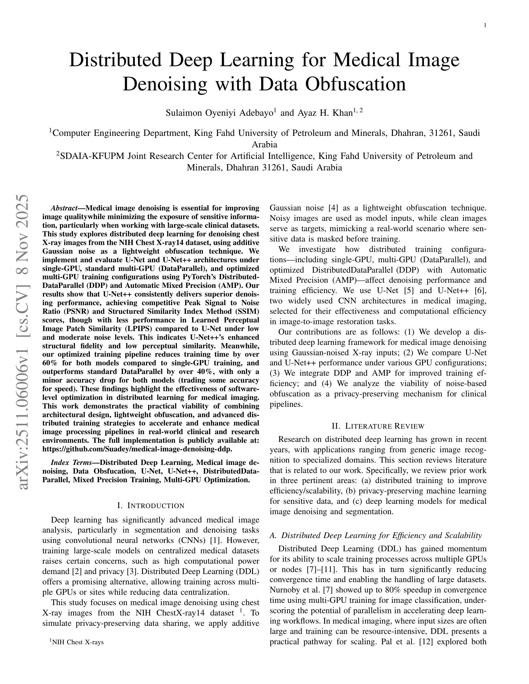 医学图像去噪对于提高图像质量并最小化敏感信息的暴露至关重要,特别是在处理大规模临床数据集时。本研究探索了分布式深度学习在NIH Chest X-ray14数据集胸部X射线图像去噪方面的应用,采用高斯噪声作为轻量级模糊技术。我们在单个GPU、标准多GPU(DataParallel)和优化多GPU训练配置下实现了U-Net和U-Net++架构,使用PyTorch的DistributedDataParallel(DDP)和自动混合精度(AMP)。我们的结果表明,U-Net++在去噪性能方面始终表现更优,在峰值信噪比(PSNR)和结构相似性指数方法(SSIM)方面取得了有竞争力的成绩,但在低噪声和中噪声水平下,其在学习的感知图像块相似性(LPIPS)方面的表现略逊于U-Net。这表明U-Net++具有更高的结构保真度和较低的感知相似性。同时,我们的优化训练管道将两个模型相对于单个GPU训练的时间缩短了超过60%,并且相较于标准的DataParallel提高了超过40%,同时两个模型的精度略有下降(以牺牲一些准确性换取速度)。这些发现突显了软件级优化在医学成像分布式学习中的有效性。这项工作证明了结合架构设计、轻量级模糊技术和先进的分布式训练策略,可以加速和改进真实临床和研究环境中的医学图像处理流程的实际可行性。完整的实现可公开访问:https://github.com/Suadey/medical-image-denoising-ddp。