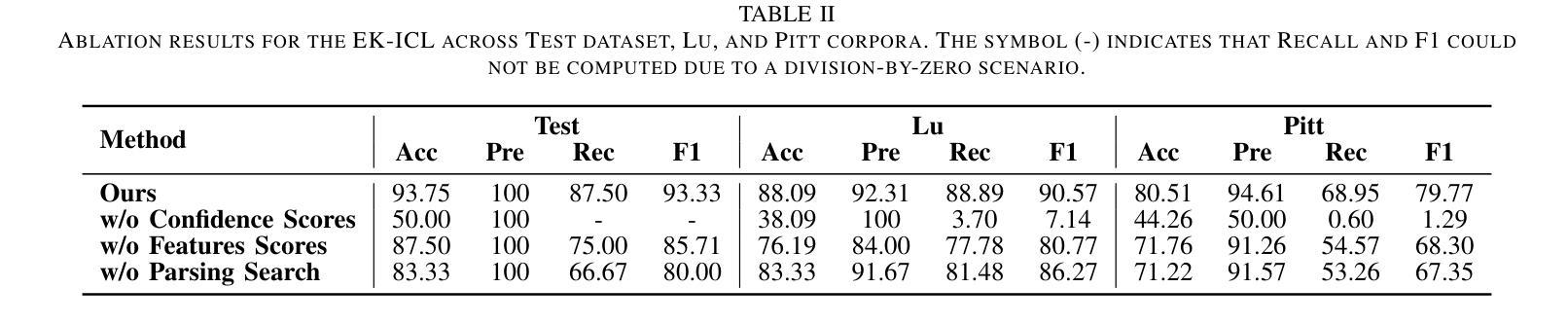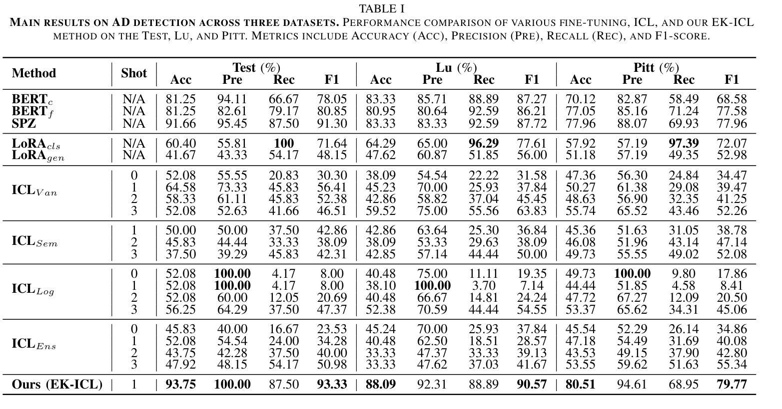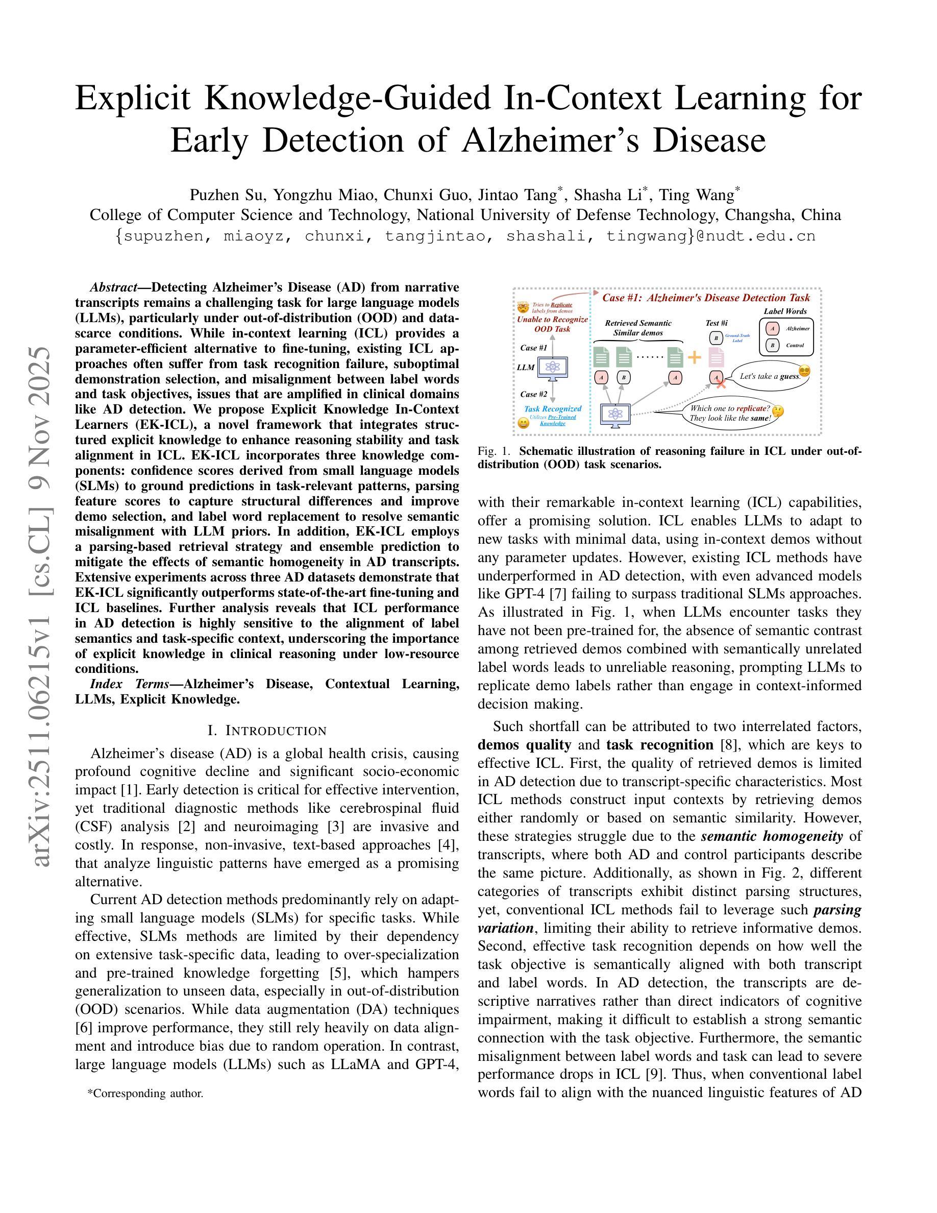 基于文本描述,提出一种名为EK-ICL的新框架,该框架结合结构化明确知识,以提高上下文学习中的推理稳定性与任务对齐。通过引入小语言模型的置信度评分、解析特征评分和标签词替换三个知识组件来解决任务识别失败、示范选择不佳和标签词与任务目标间的对齐问题。并通过解析式检索策略和集成预测缓解AD转录本的语义同质性问题。在三个AD数据集上的广泛实验表明,EK-ICL显著优于先进的微调与上下文学习基线。分析表明,AD检测中的上下文学习性能高度依赖于标签语义与任务特定上下文的对齐,突显在低资源条件下临床推理中明确知识的重要性。