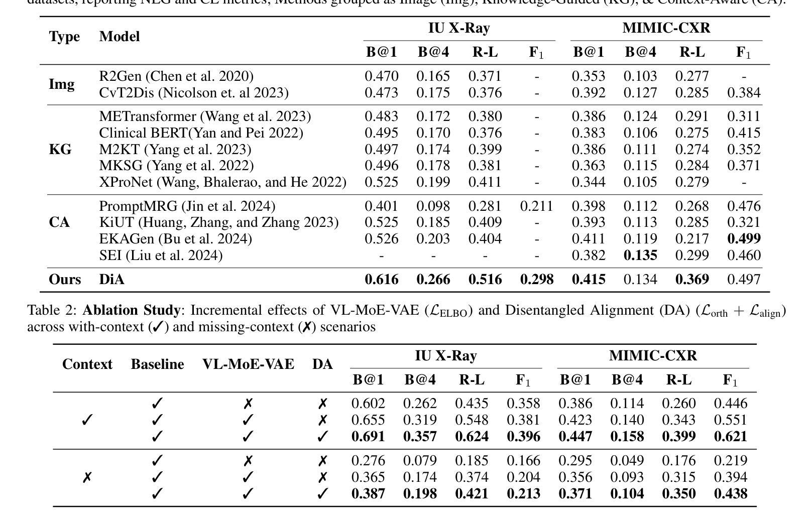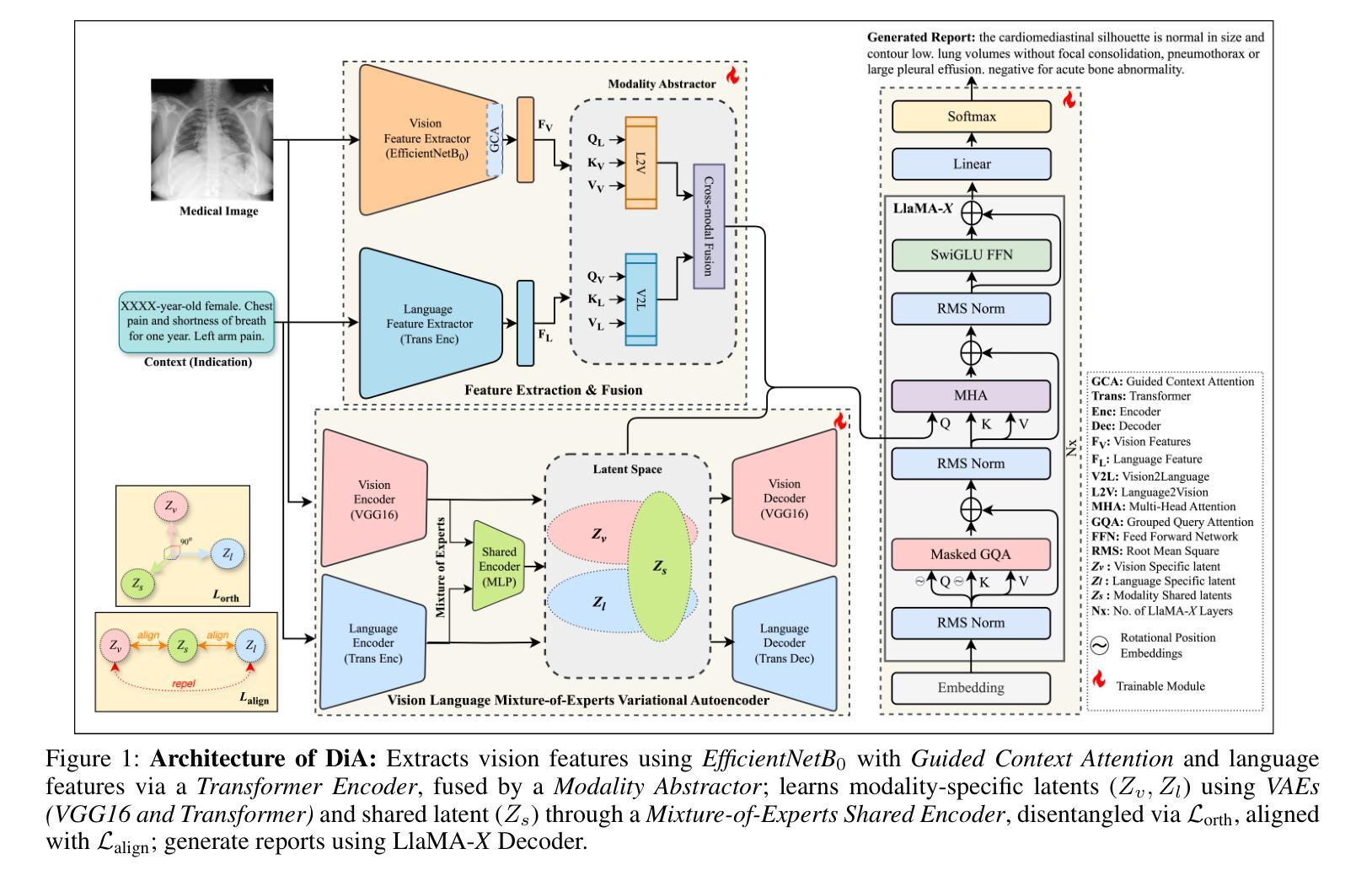 - DiA-gnostic VLVAE框架通过解纠缠对齐解决这些问题,实现稳健的放射学报告生成。