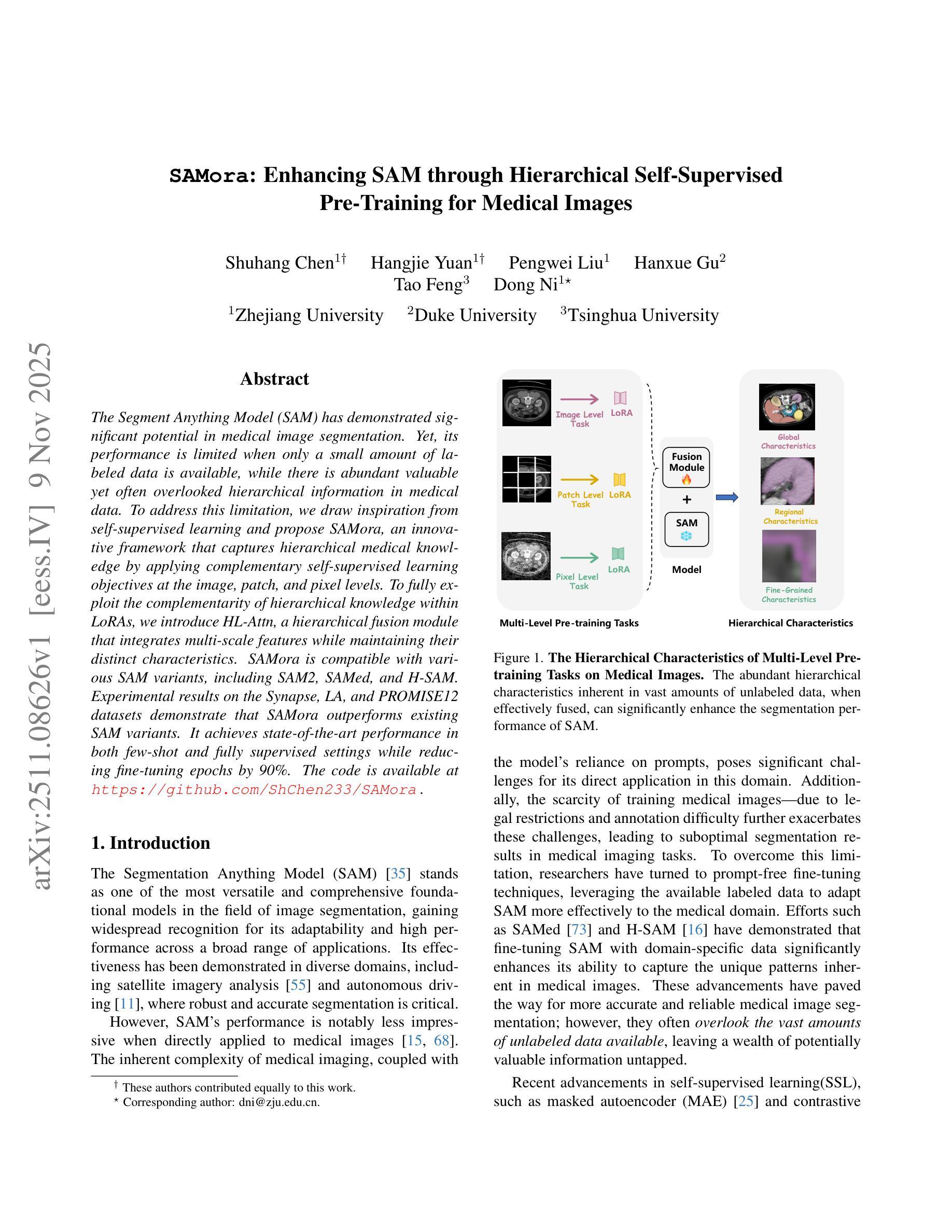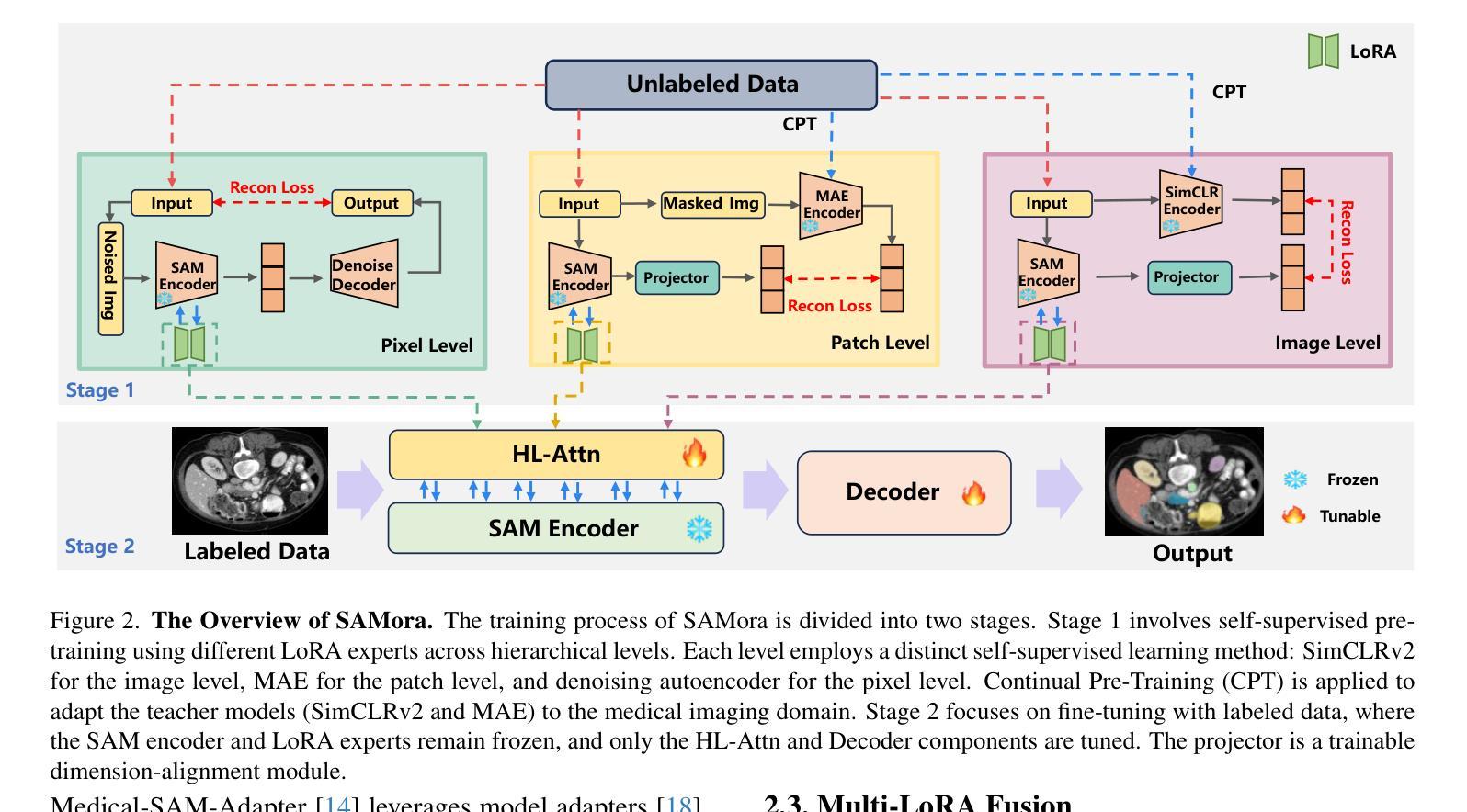 Segment Anything Model(SAM)在医学图像分割中展现出了巨大的潜力。然而,当只有少量标记数据时,其性能受到限制,而医学数据中存在着大量有价值但被忽略的层级信息。为了解决这一限制,我们受到自我监督学习的启发,提出了SAMora,这是一个创新框架,它通过应用图像、补丁和像素级别的互补自我监督学习目标来捕获医学知识的层次结构。为了充分利用LoRAs内部层次知识的互补性,我们引入了HL-Attn,这是一个层次融合模块,能够整合多尺度特征,同时保持其独特特性。SAMora可以与各种SAM变体兼容,包括SAM2、SAMed和H-SAM。在Synapse、LA和PROMISE12数据集上的实验结果表明,SAMora优于现有的SAM变体。它在小样本和完全监督设置下达到了最先进的性能,同时减少了微调周期达90%。代码可在https://github.com/ShChen233/SAMora获取。