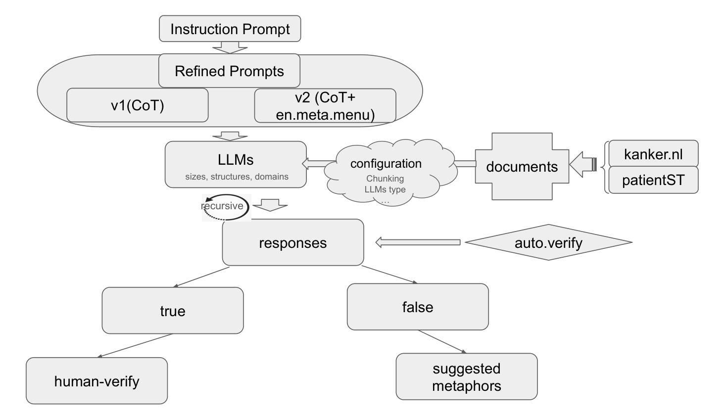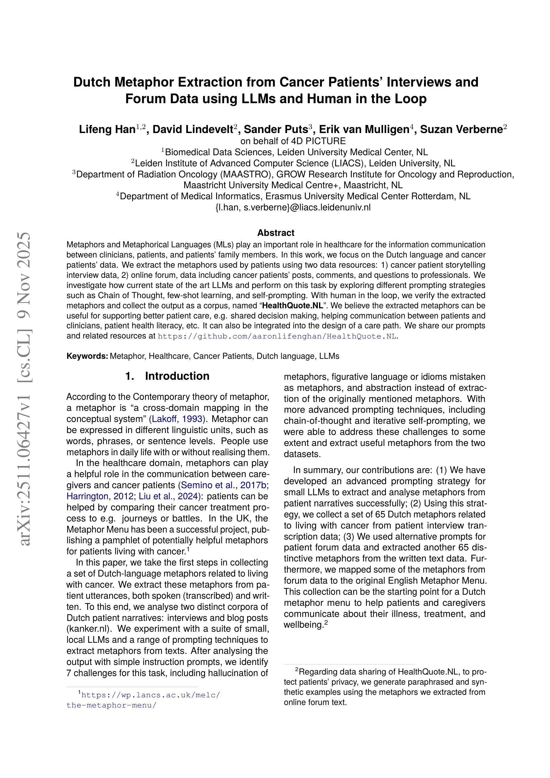 隐喻和隐喻语言(MLs)在医生、患者和患者家庭成员之间的医疗卫生沟通中发挥着重要作用。在这项工作中,我们重点关注来自癌症患者的荷兰语数据。我们通过两个数据源提取患者使用的隐喻:(1)癌症患者讲故事访谈数据;(2)在线论坛数据,包括患者的帖子、评论和向专业人士提出的问题。我们通过探索不同的提示策略,如思维链推理、小样本学习和自我提示,来研究当前最先进的大型语言模型(LLMs)在此任务上的表现。通过人工循环设置,我们验证了提取的隐喻,并将输出编译成名为HealthQuote.NL的语料库。我们相信提取的隐喻可以改善患者护理,例如支持共同决策、改善患者与临床医生之间的沟通以及提高患者的健康素养。它们还可以为个性化护理路径的设计提供信息。我们在https://github.com/aaronlifenghan/HealthQuote.NL分享提示和相关资源。