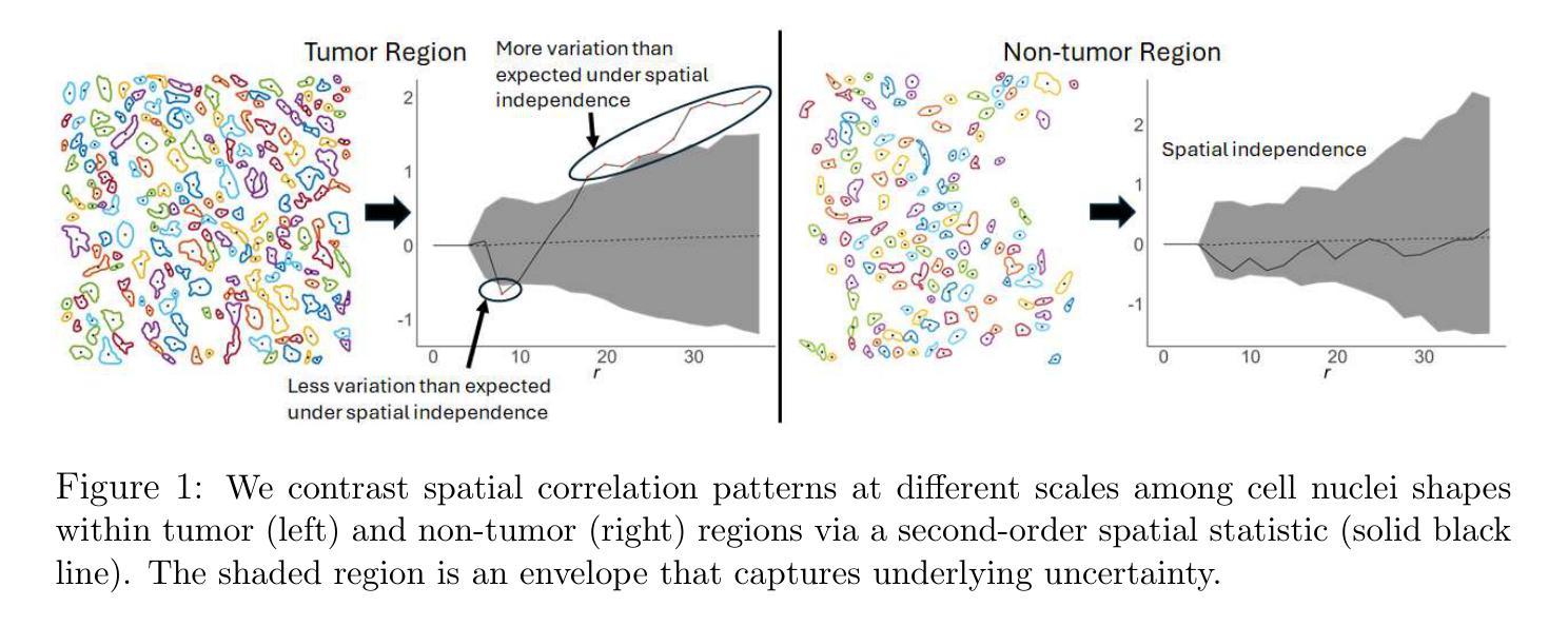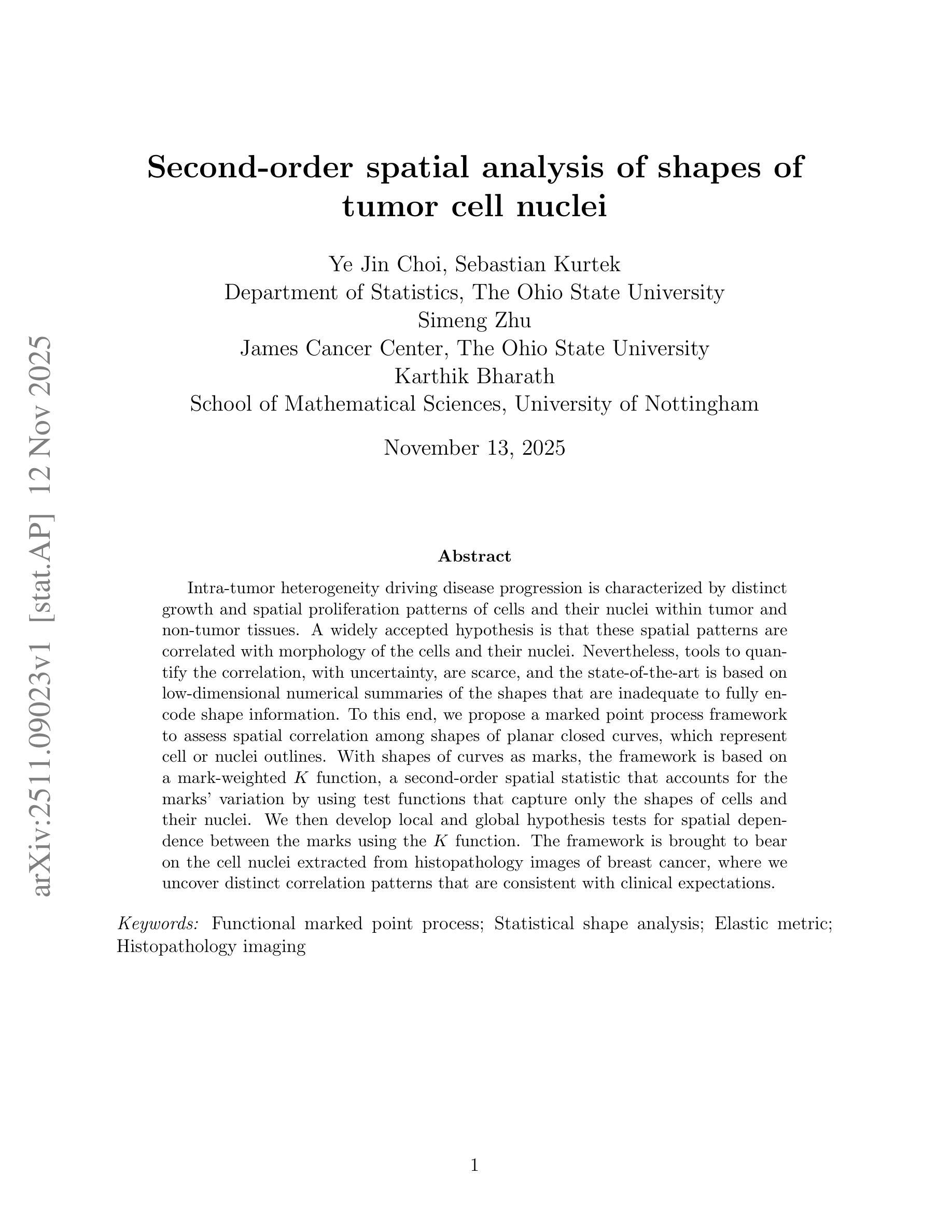 肿瘤内异质性推动疾病进展的特点是肿瘤和非肿瘤组织内细胞及其细胞核的独特生长和空间增殖模式。一个被广泛接受的假设是,这些空间模式与细胞和细胞核的形态有关。然而,用来量化这种不确定关联的工具却很稀缺,当前的技术是基于对形状的低维数值摘要,这不足以完全编码形状信息。为此,我们提出了一个标记点过程框架,用于评估平面闭合曲线形状之间的空间相关性,这些曲线代表细胞或细胞核的轮廓。以曲线形状为标记,该框架基于标记加权K函数,这是一个二阶空间统计量,通过使用仅捕捉细胞和细胞核形状的测试函数来考虑标记的变化。然后,我们为标记之间使用K函数进行局部和全局假设检验空间依赖性。该框架应用于从乳腺癌组织病理学图像中提取的细胞核上,我们发现了一些明显的关联模式,这些模式与临床预期相符。