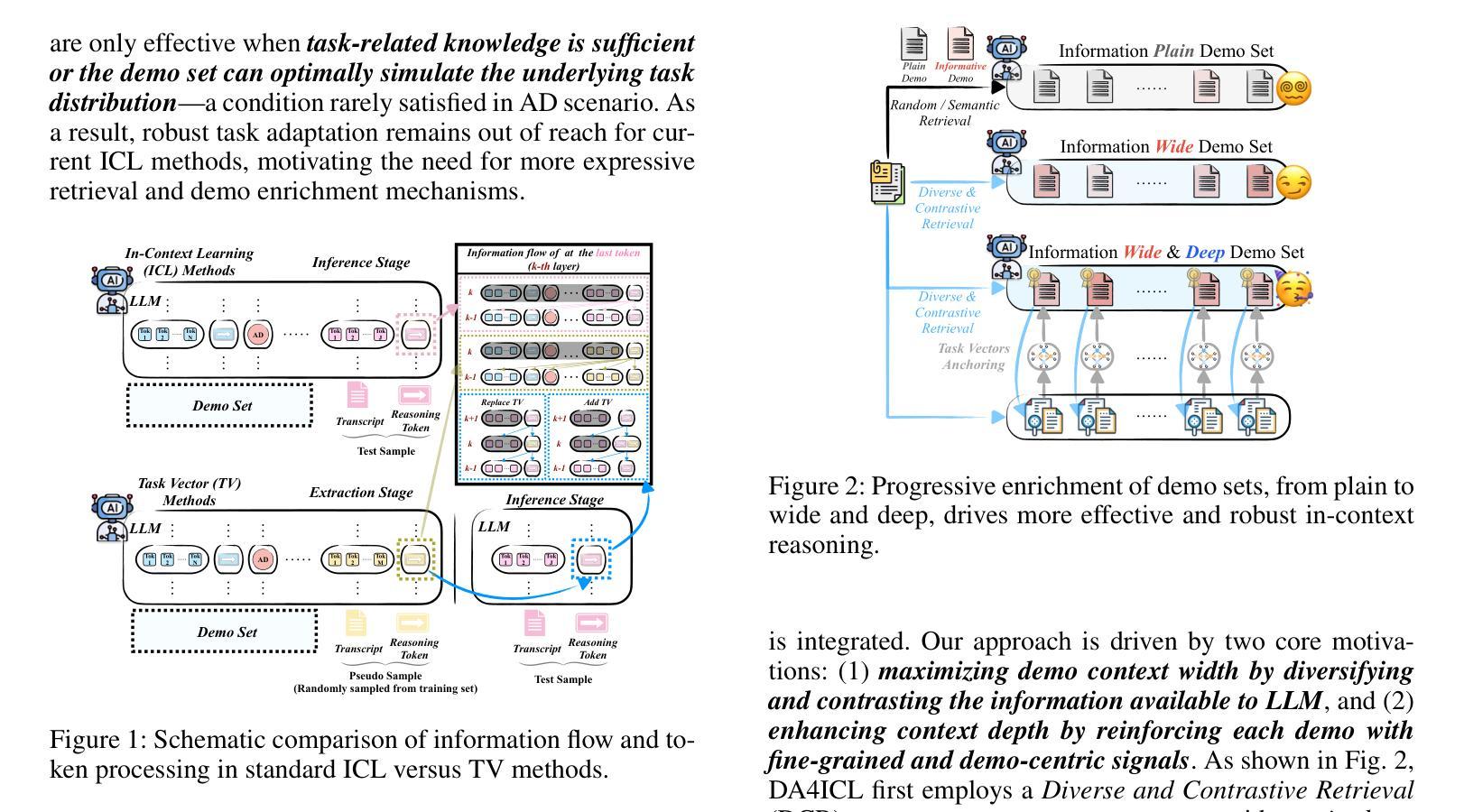 从叙事记录中检测阿尔茨海默病(AD)对于大型语言模型(LLM)是一大挑战:预训练很少涉及这种偏离分布的任务,所有的转录示例都描述同一场景,导致高度同质的上下文环境。这些因素不仅影响模型对内置任务知识(任务认知)的认知能力,还影响其识别细微且类别可辨识线索(上下文感知)的能力。由于认知在预训练后已固定,因此提高阿尔茨海默病检测能力的上下文学习(ICL)依赖于通过更好的演示集来丰富感知能力。我们证明标准ICL很快达到饱和状态,其演示缺乏多样性(上下文宽度)且无法传递精细信号(上下文深度),而最近的基于任务向量(TV)的方法通过向LLM的隐藏状态(HSs)注入TV改善了广泛的任务适应性,但由于注入的粒度、强度和位置的匹配问题,它们不适用于阿尔茨海默病的检测。为了克服这些瓶颈,我们引入了以演示为中心的锚定框架DA4ICL,它通过通过不同方式和对比检索来同时扩展上下文宽度和不同深度来深化每个演示信号的感知投影向量锚定法,该框架在每个Transformer层上执行这两个操作。在三个阿尔茨海默病基准测试中,DA4ICL与ICL和TV基线相比取得了稳定的大幅增长,为精细、偏离正常情境和低资源语言模型适应领域创造了新的范例。