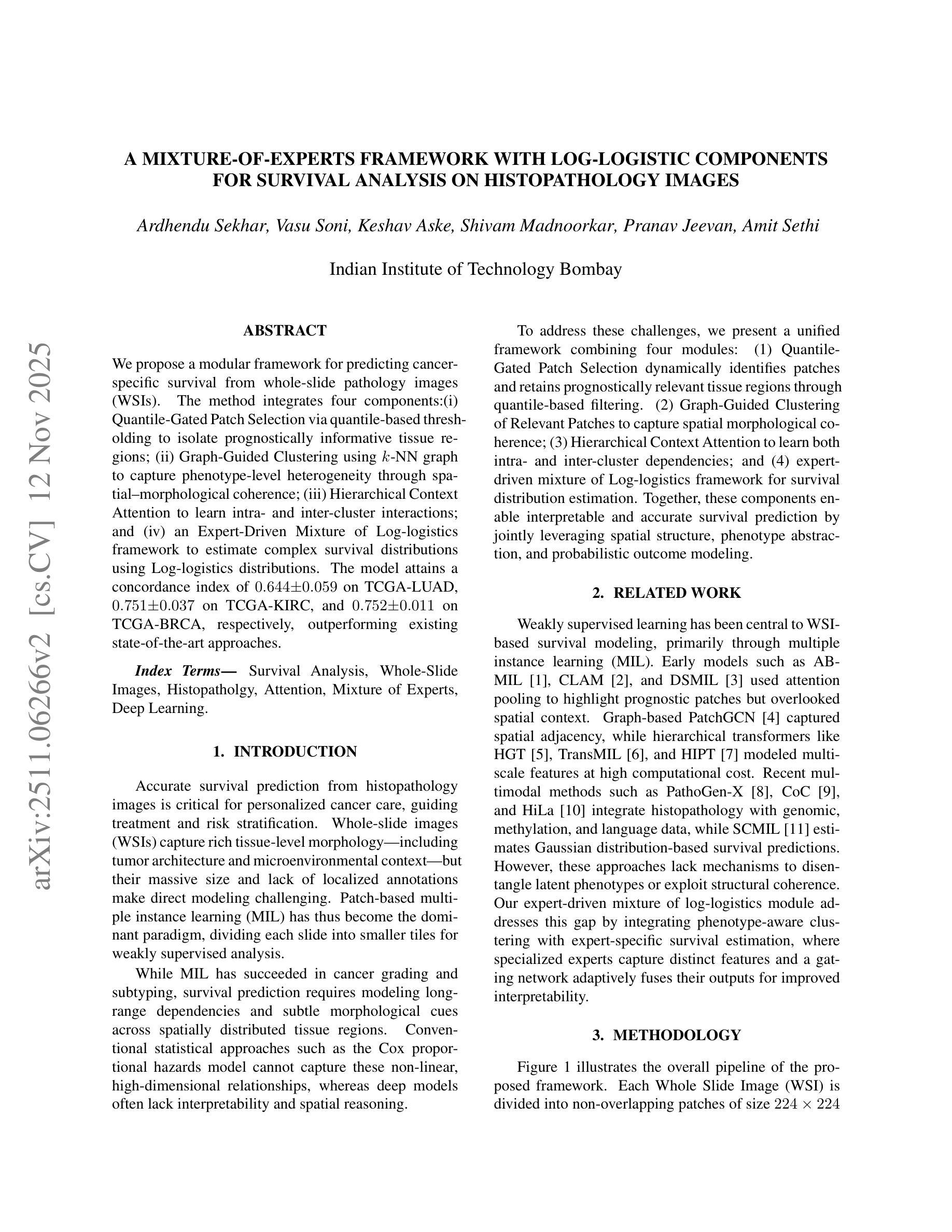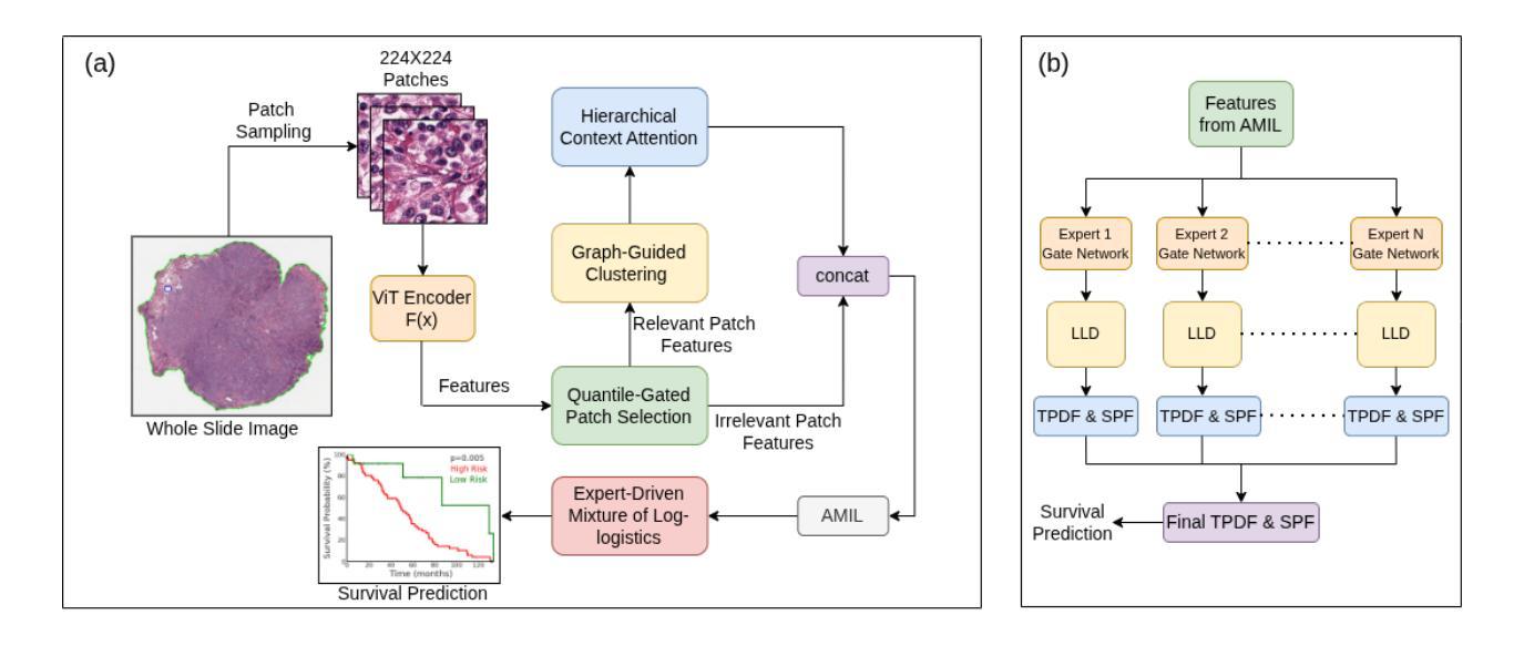我们提出一种模块化框架,用于从全病理切片图像(WSI)预测癌症特异性生存。该方法融合了四个组件:(i)基于分位数阈值的Quantile Gated Patch Selection,用于隔离预后信息丰富的组织区域;(ii)使用k近邻图的Graph Guided Clustering,通过空间形态一致性捕捉表型水平异质性;(iii)层次上下文注意力(Hierarchical Context Attention),学习集群内部和外部的交互作用;(iv)专家驱动的混合对数逻辑框架(Expert Driven Mixture of Log logistics framework),利用对数逻辑分布估计复杂的生存分布。该模型在TCGA LUAD上达到0.644的契合指数,在TCGA KIRC上达到0.751,在TCGA BRCA上达到0.752,超过了现有先进技术方法的性能。