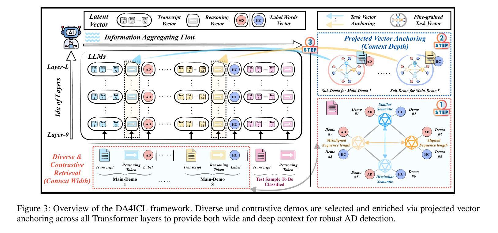 Detecting Alzheimer’s disease (AD) from narrative transcripts challenges large language models (LLMs): pre-training rarely covers this out-of-distribution task, and all transcript demos describe the same scene, producing highly homogeneous contexts. These factors cripple both the model’s built-in task knowledge (\textbf{task cognition}) and its ability to surface subtle, class-discriminative cues (\textbf{contextual perception}). Because cognition is fixed after pre-training, improving in-context learning (ICL) for AD detection hinges on enriching perception through better demonstration (demo) sets. We demonstrate that standard ICL quickly saturates, its demos lack diversity (context width) and fail to convey fine-grained signals (context depth), and that recent task vector (TV) approaches improve broad task adaptation by injecting TV into the LLMs’ hidden states (HSs), they are ill-suited for AD detection due to the mismatch of injection granularity, strength and position. To address these bottlenecks, we introduce \textbf{DA4ICL}, a demo-centric anchoring framework that jointly expands context width via \emph{\textbf{Diverse and Contrastive Retrieval}} (DCR) and deepens each demo’s signal via \emph{\textbf{Projected Vector Anchoring}} (PVA) at every Transformer layer. Across three AD benchmarks, DA4ICL achieves large, stable gains over both ICL and TV baselines, charting a new paradigm for fine-grained, OOD and low-resource LLM adaptation.