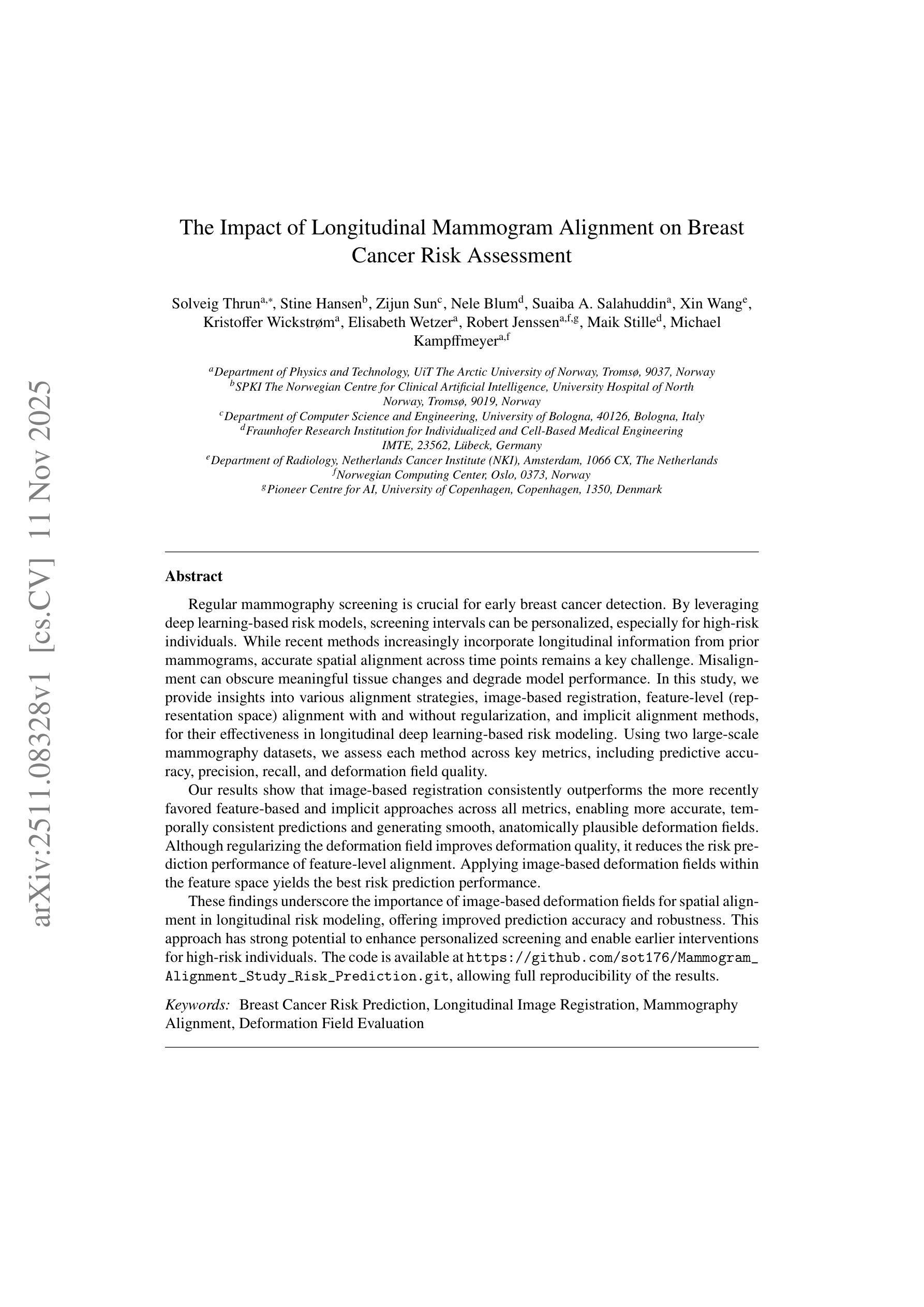 规律性的乳腺钼靶筛查对于早期乳腺癌的发现至关重要。通过利用基于深度学习的风险模型,可以实现个性化的筛查间隔,尤其适用于高风险个体。虽然近期的方法越来越多地融入了先前钼靶摄影的纵向信息,但时间点上准确的空间对齐仍是一个关键挑战。错位可能会掩盖有意义的组织变化,并降低模型性能。在本研究中,我们深入探讨了各种对齐策略,包括基于图像的注册、特征级(表示空间)对齐(有/无正则化)以及隐式对齐方法,它们在基于深度学习的纵向风险模型中的有效性。使用两个大规模的钼靶摄影数据集,我们根据关键指标评估了每种方法,包括预测精度、精确度、召回率和变形场质量。我们的结果表明,基于图像的注册在所有指标上始终优于最近更受欢迎的基于特征和隐式的方法,能够实现更精确、时间上一致的预测,并生成平滑、解剖上合理的变形场。虽然对变形场进行正则化提高了变形质量,但它降低了特征级对齐的风险预测性能。在特征空间内应用基于图像的变形场可以获得最佳的风险预测性能。这些发现强调了基于图像的变形场在纵向风险模型中的空间对齐的重要性,提高了预测精度和稳健性。这种方法有望提高个性化筛查,并为高风险个体更早地采取干预措施。代码可在https://github.com/sot176/Mammogram_Alignment_Study_Risk_Prediction.git上获取,以实现结果的完全可重复性。