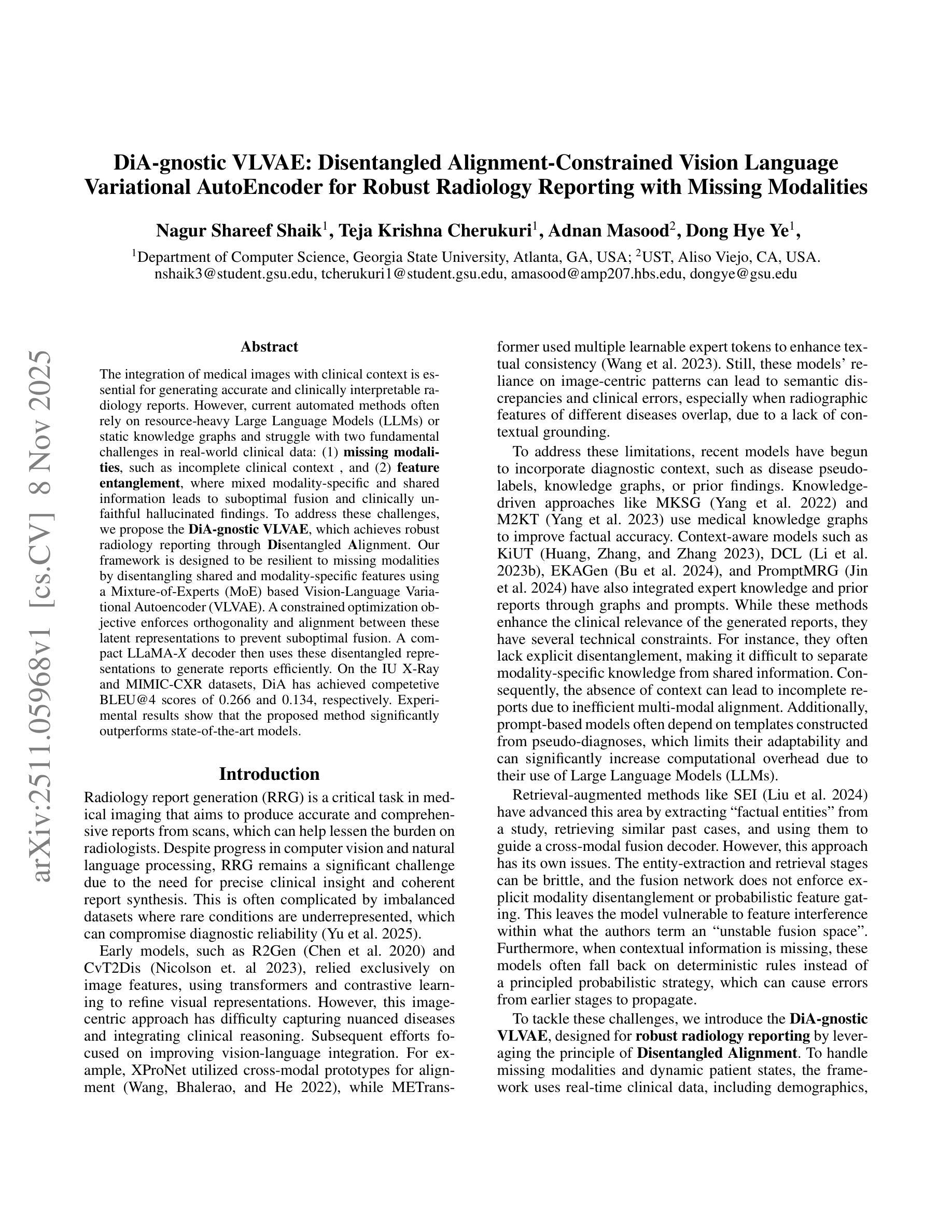本文强调医学图像与临床背景的融合对生成准确且可解释的放射学报告的重要性。针对现有自动化方法面临如缺失模态和特征纠缠等挑战,提出了DiA-gnostic VLVAE框架,通过解纠缠对齐实现稳健的放射学报告生成。该框架采用基于MoE的Vision-Language Variational Autoencoder (VLVAE)来分离共享和模态特定特征,并通过约束优化目标实现这些潜在表示之间的正交性和对齐,从而防止次优融合。使用LLaMA-X解码器生成报告。在IU X-Ray和MIMIC-CXR数据集上的实验结果表明,该方法显著优于现有模型。
