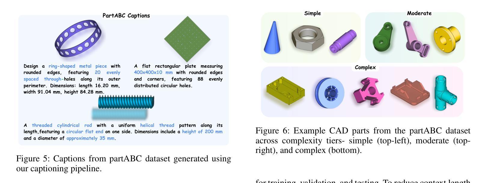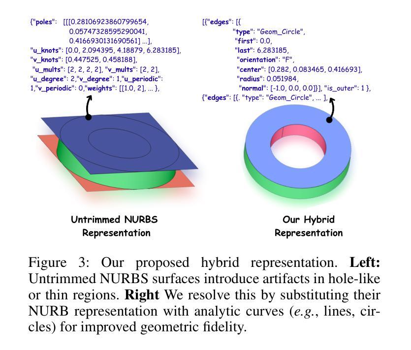 基于非均匀有理B样条(NURBS)技术,我们提出了一种全新的框架NURBGen,它能直接从文本生成高质量的三维CAD模型。通过微调大型语言模型(LLM),将自由形式的文本转换为包含NURBS曲面参数的JSON表示形式,进而通过Python直接转换为BRep格式。我们还提出了一种混合表示法,结合了未修剪的NURBS和解析基本体,以更稳健地处理修剪曲面和退化区域,同时降低标记复杂性。此外,我们引入了包含CAD组件的partABC数据集子集,采用自动化注释管道对其实施详细的注释。在多种提示上表现出色,几何保真度和尺寸精度均优于现有方法,专家评估结果证实了这一点。代码和数据集将公开发布。
