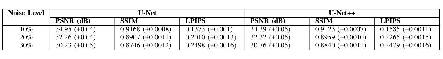 - 在低噪声和中噪声水平下,U-Net++表现出较高的结构保真度和较低的感知相似性。
