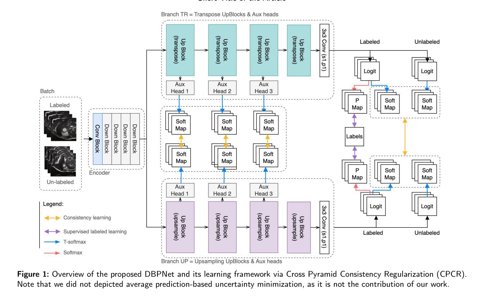 半监督学习用于训练医学图像分割模型,通过利用大量未标记数据和少量仔细标记的数据,实现更高效的模型训练。本文提出了一种混合一致性学习方法,通过利用两个解码器之间的跨金字塔一致性正则化(CPCR)来有效利用未标记数据。设计了一种混合双分支金字塔网络(DBPNet),并结合现有的一致性学习方法和不确定性最小化策略,提出了一种名为CPCR的学习策略。实验结果表明,DBPNet与CPCR相比五种最先进的自监督学习方法具有优越性,并在公共基准数据集上的性能与最新方法相当。