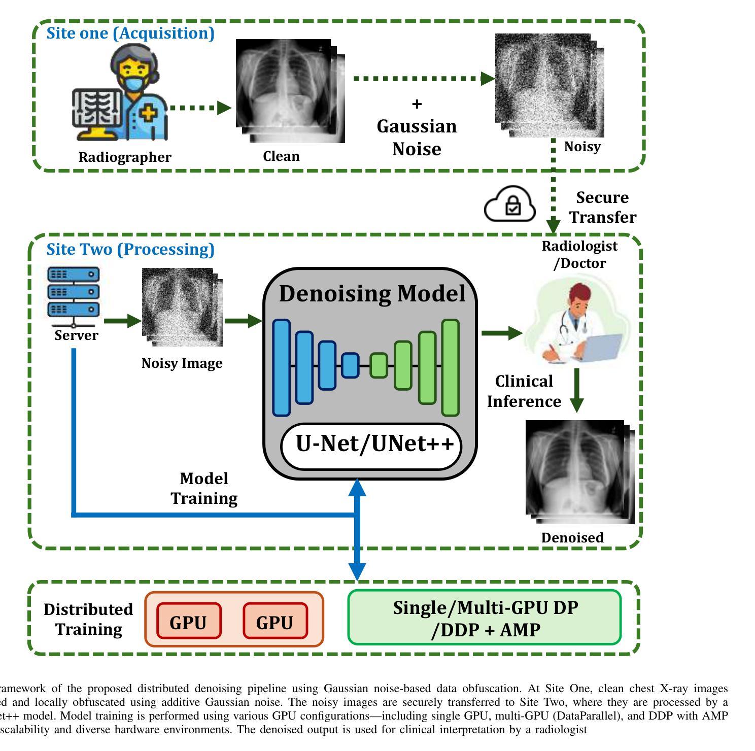 本研究探讨了基于分布式深度学习的医学图像去噪技术,特别是针对胸部X射线图像的应用。研究采用了NIH Chest X-ray14数据集,使用添加高斯噪声作为轻量级混淆技术。研究实现了U-Net和U-Net++架构,并在单GPU、标准多GPU和优化多GPU训练配置下进行了评估。结果显示,U-Net++在去噪性能上表现更优秀,在峰值信噪比(PSNR)和结构相似性指数方法(SSIM)方面表现出竞争力,但在低噪声和中噪声水平下感知图像块相似性(LPIPS)方面的表现略逊于U-Net。这表明U-Net++具有更高的结构保真度和较低的感知相似性。同时,优化训练管道将两个模型的训练时间减少了60%以上,与单GPU训练相比提高了性能,并优于标准DataParallel训练,但以轻微的性能下降为代价。该研究展示了结合架构设计、轻量级混淆和高级分布式训练策略在实际临床和研究环境中加速和改进医学图像处理流程的实用性。