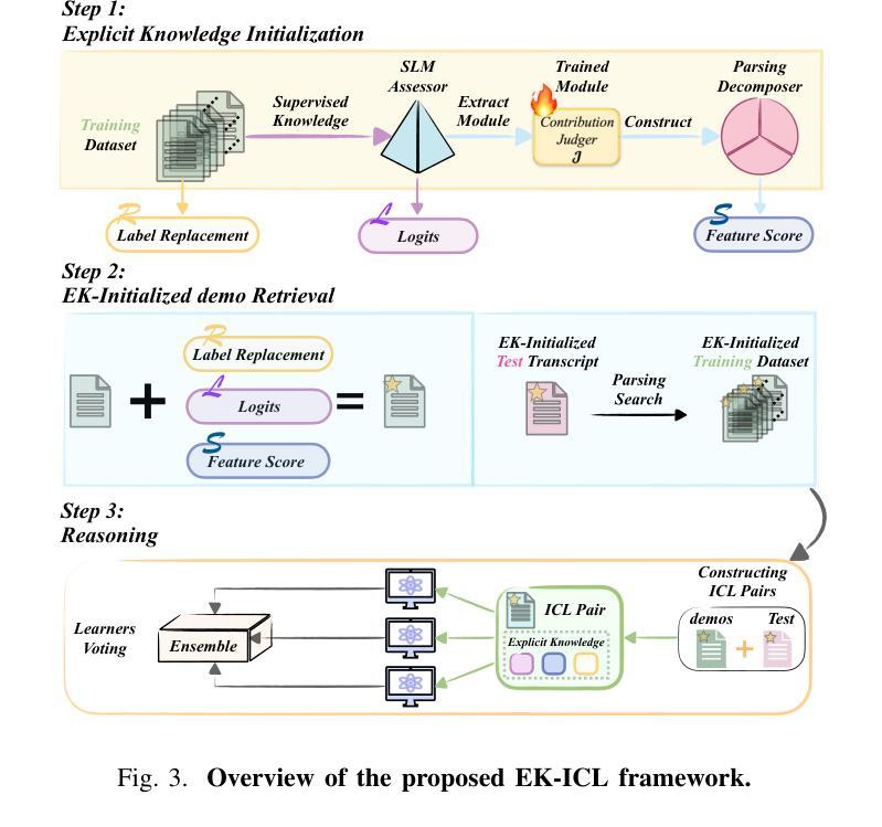 - EK-ICL框架结合了结构化明确知识来提高推理稳定性和任务对齐。包括小语言模型的置信度评分、解析特征评分和标签词替换三个知识组件。
