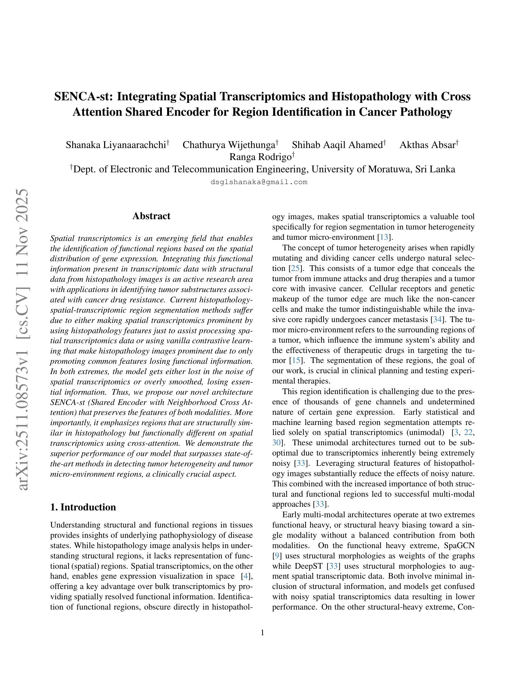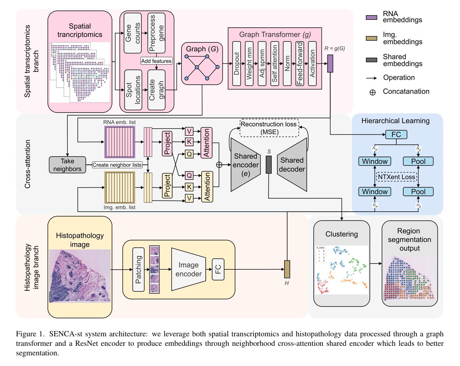 空间转录组学是一个新兴领域,它可以根据基因表达的空间分布来识别功能区域。将转录组数据中的功能信息与组织病理学图像的结构数据相结合,是一个活跃的研究领域,在识别与癌症药物抵抗相关的肿瘤亚结构方面具有应用前景。当前的组织病理学-空间转录组区域分割方法存在缺陷,要么过分强调空间转录组学,仅使用组织病理学特征辅助处理空间转录组数据;要么使用普通的对比学习,使得组织病理学图像因仅强调共同特征而失去功能信息。在这两种极端情况下,模型要么迷失在噪声的空间转录组中,要么过于平滑而失去关键信息。因此,我们提出了新颖架构SENCA-st(具有邻域交叉注意力的共享编码器),能够保留两种模式的特征。更重要的是,它利用交叉注意力强调在组织病理学结构上相似但在空间转录组学上功能不同的区域。我们展示了模型在检测肿瘤异质性和肿瘤微环境区域方面的卓越性能,这是临床上至关重要的方面,超越了最先进的方法。