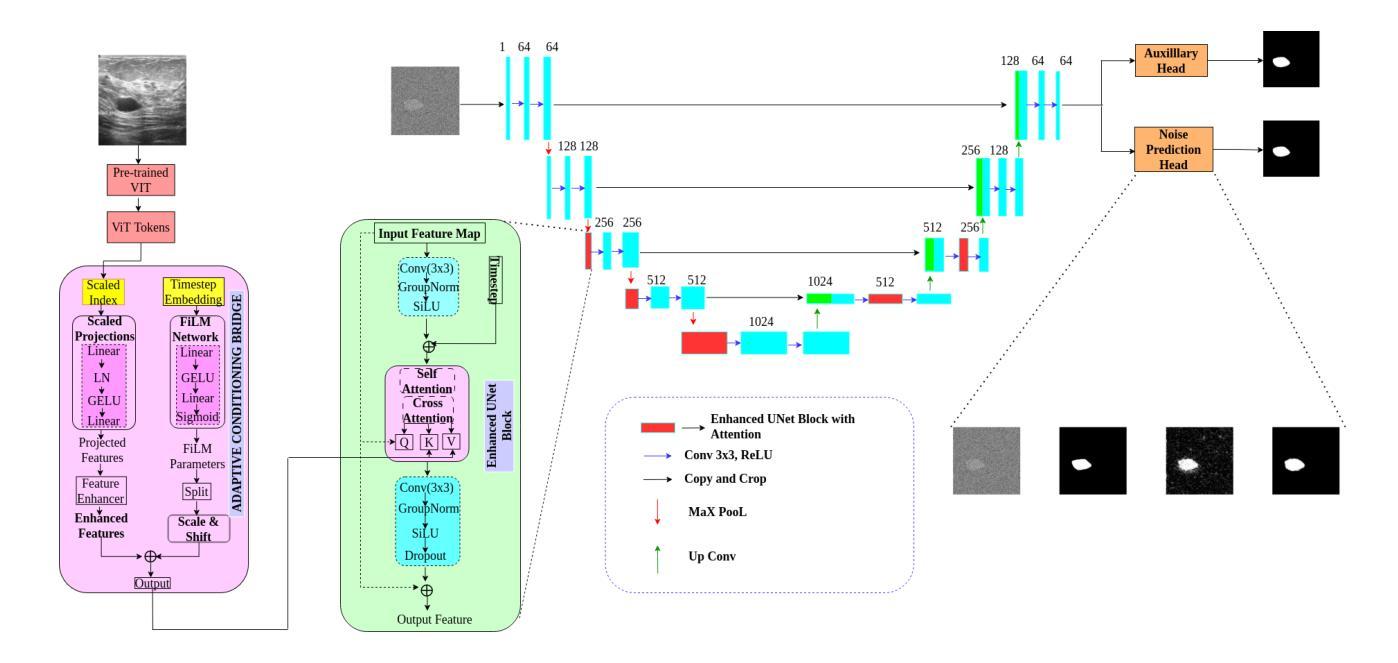 在乳腺超声图像中,精确的病变分割对于早期诊断至关重要。然而,由于对比度低、斑点噪声和边界不清等问题,这一任务变得困难。尽管深度学习模型已经显示出潜力,但标准的卷积架构通常难以捕获足够的全局上下文信息,导致分割结果解剖上不连贯。为了克服这些缺点,我们提出了一种灵活的、有条件的去噪扩散模型,该模型结合了基于增强型UNet的生成解码器和Vision Transformer(ViT)编码器进行全局特征提取。我们引入了三个主要创新点:1)自适应条件桥(ACB)实现语义特征的高效多尺度融合;2)一种新的拓扑去噪一致性(TDC)损失组件,通过惩罚去噪过程中的结构不一致性来规范训练;3)双头架构利用去噪目标作为强大的正则化器,使轻量级辅助头能够在较小数据集上执行快速而准确的推理,以及一个噪声预测头。我们的框架在公共乳腺超声数据集上达到了最新水平,在BUSI上实现了0.96的Dice得分,在BrEaST上实现了0.90的Dice得分,以及在BUS-UCLM上实现了0.97的Dice得分。综合消融研究经验性地验证了模型组件对于实现这些结果和产生既准确又解剖上合理分割的关键作用。