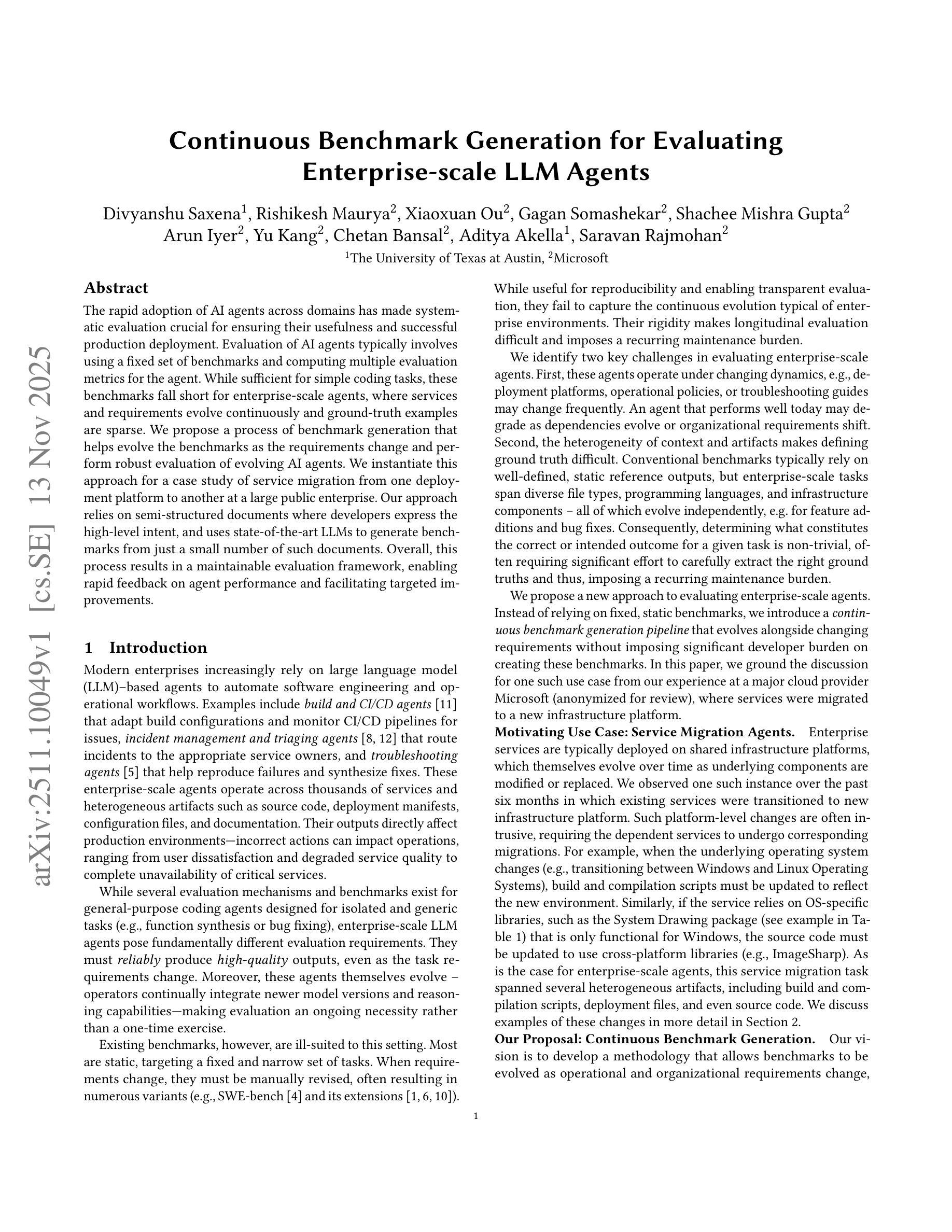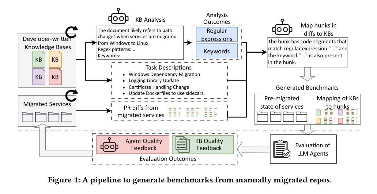 随着人工智能代理在各个领域中的快速采用,对其进行系统评估对于确保其有用性和成功的产品部署至关重要。对人工智能代理的评估通常涉及使用固定的基准测试集并为代理计算多个评估指标。虽然这对于简单的编码任务来说已经足够了,但这些基准测试对于企业级规模的代理来说却不足够应对,因为服务和要求在不断地发展变化,而真实情况的例子却很少见。我们提出了一种基准测试生成过程,该过程有助于随着要求的改变而不断发展基准测试,并对不断变化的人工智能代理进行稳健评估。我们通过一项案例研究来实例化这种方法,该案例研究是关于大型公共企业从一个部署平台迁移到另一个部署平台的服务迁移。我们的方法依赖于半结构化文档,开发者在其中表达高级意图,并使用最先进的LLM从少量此类文档中生成基准测试。总的来说,这个过程形成了一个可持续的评估框架,能够迅速反馈代理性能并进行有针对性的改进。