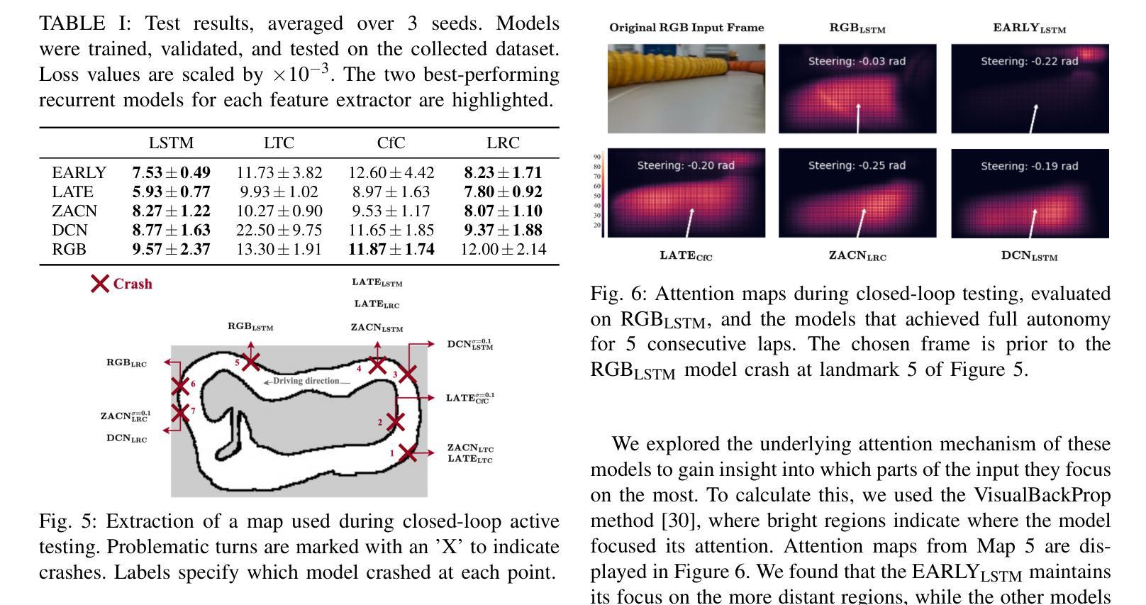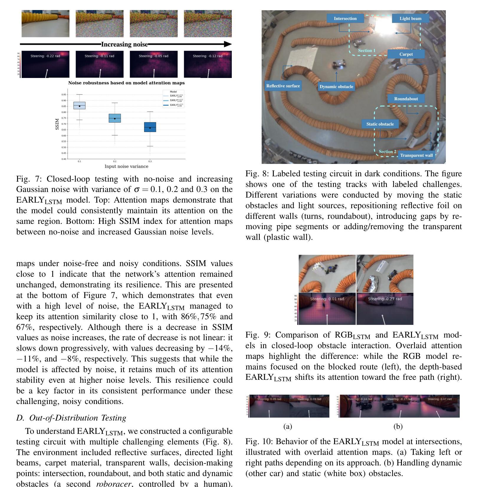 融合RGB与深度信息后,自主代理的预测转向指令能力显著提升,对比仅使用RGB信息更具优势。采用轻量级循环控制器利用融合RGB-D特征进行序列决策。通过专家驾驶的小型自主汽车收集高质量数据训练模型,可成功部署于实际硬件上并避免动态与静态障碍。早期融合深度数据使控制器高度稳健,即使在帧丢失和噪声增加时仍有效,且不影响网络的任务专注度。