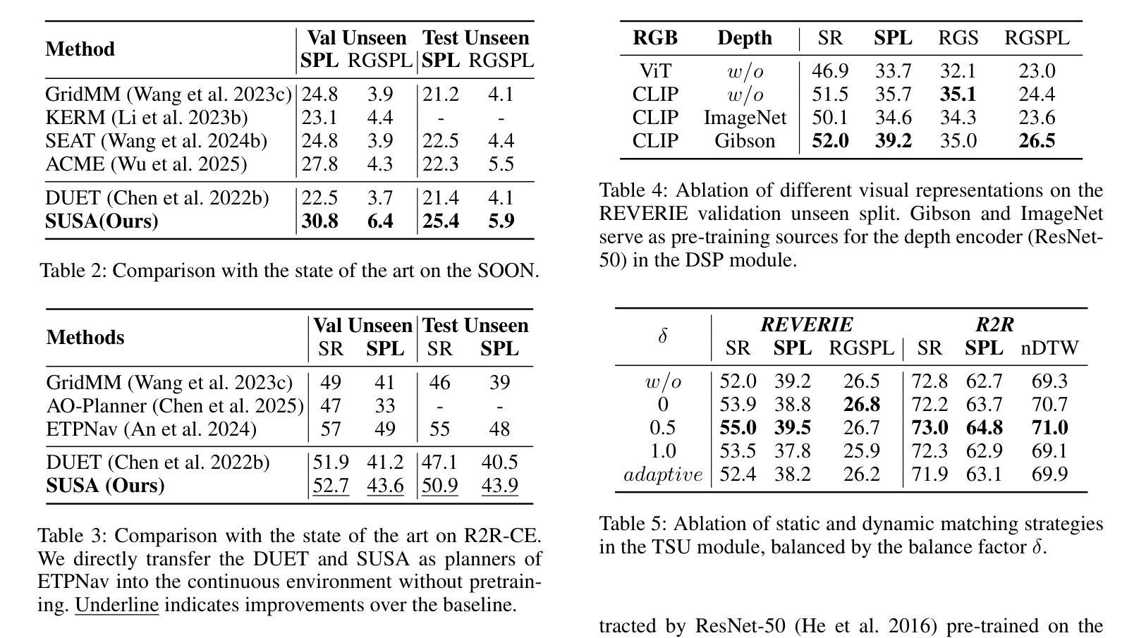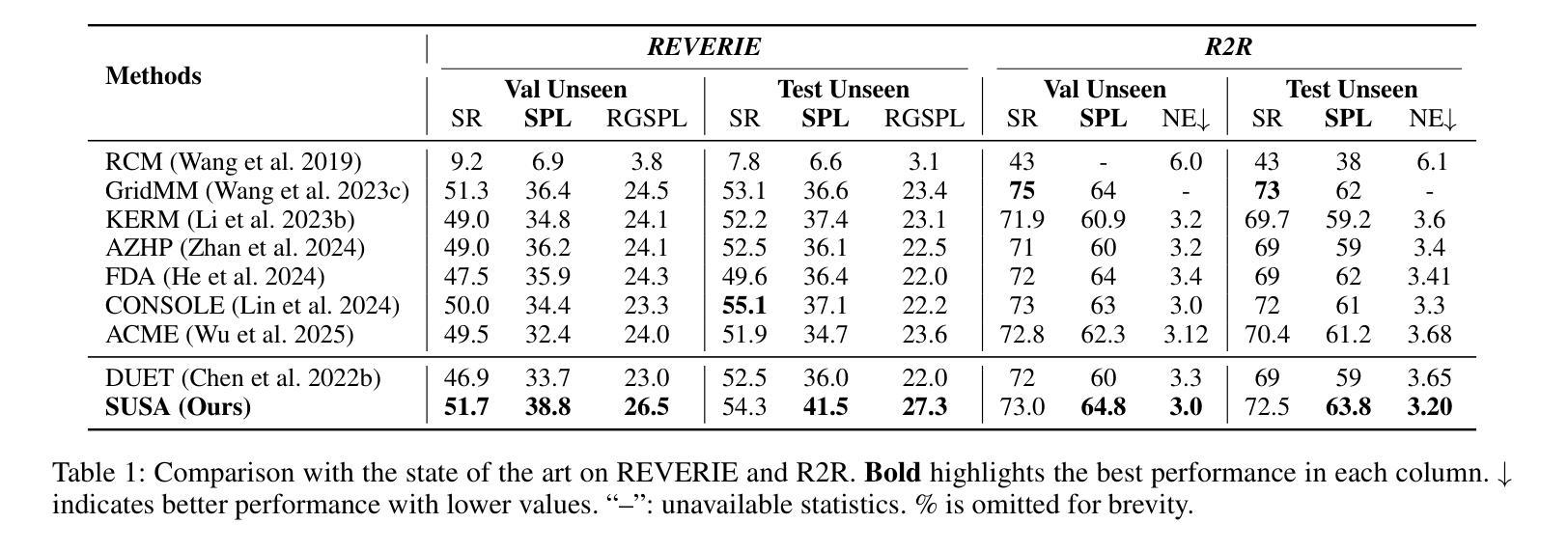 - SUSA架构在多个VLN基准测试上的性能优于基线,并具有良好的泛化能力。