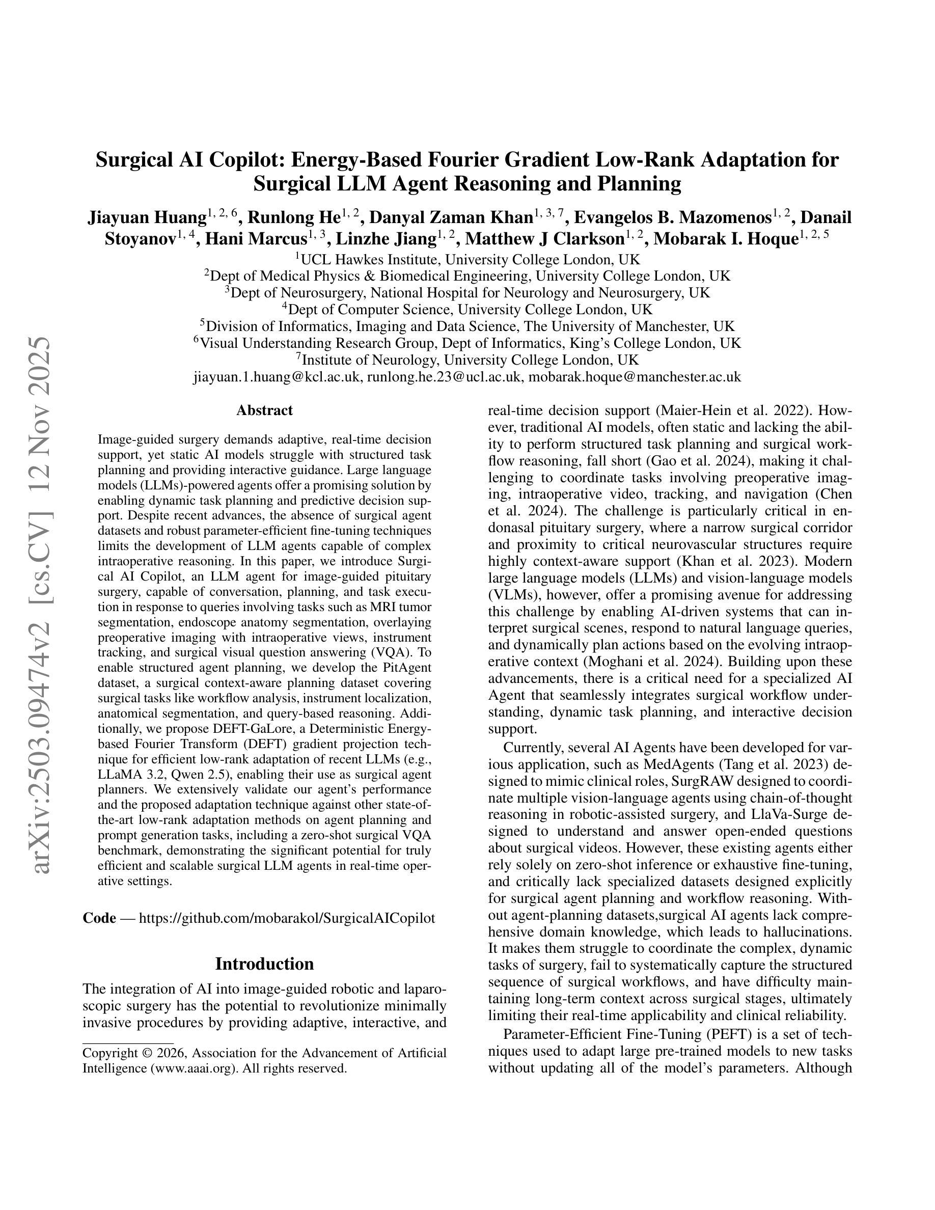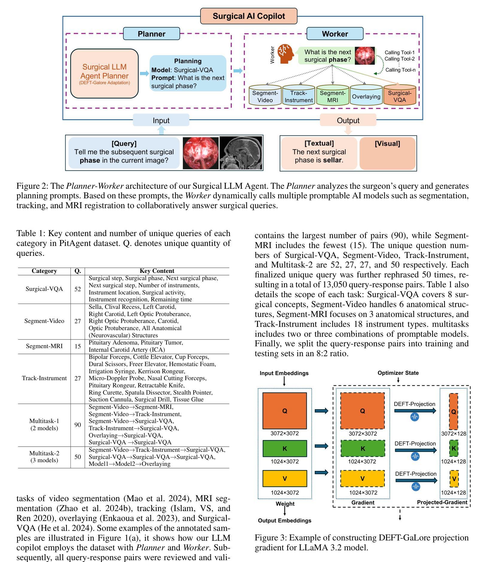 图像引导手术需要自适应、实时的决策支持,然而静态的AI模型在结构化任务规划和提供交互式指导方面存在困难。大型语言模型(LLM)驱动的代理提供了一种有前途的解决方案,能够实现动态任务规划和预测决策支持。尽管最近有所进展,但由于缺乏手术代理数据集和稳健的参数高效微调技术,能够进行复杂术中推理的LLM代理的开发受到限制。在本文中,我们介绍了Surgical AI Copilot,这是一个用于图像引导垂体手术的LLM代理,能够针对涉及MRI肿瘤分割、内窥镜解剖分割、术前影像与术中视图的叠加、仪器跟踪和手术视觉问答(VQA)等任务进行查询的会话、规划和任务执行。为了实现结构化的代理规划,我们开发了PitAgent数据集,这是一个手术上下文感知的规划数据集,涵盖手术任务,如工作流程分析、仪器定位、解剖分割和基于查询的推理。此外,我们提出了DEFT-GaLore,一种确定性能量基傅立叶变换(DEFT)梯度投影技术,用于最新LLMs(例如LLaMA 3.2,Qwen 2.5)的有效低秩适应,使其可作为手术代理规划师使用。我们全面验证了我们的代理性能以及所提出的适应技术与其他最先进的低秩适应方法在代理规划和提示生成任务上的表现,包括零射击手术VQA基准测试,证明了在实时操作环境中真正高效和可扩展的手术LLM代理的巨大潜力。