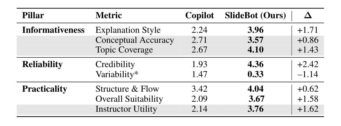 - SlideBot在概念准确性、清晰度和教学价值方面得到专家和学生的积极反馈。