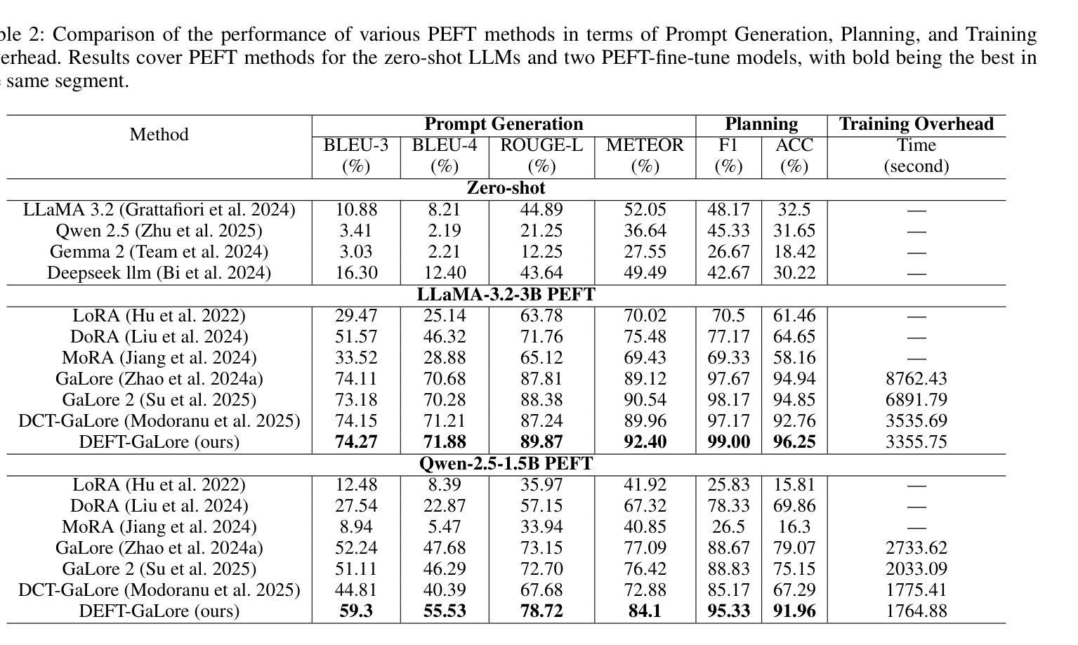 - 提出DEFT-GaLore技术,通过确定性能量基于傅里叶变换的梯度投影技术,实现LLM的高效低秩适应。