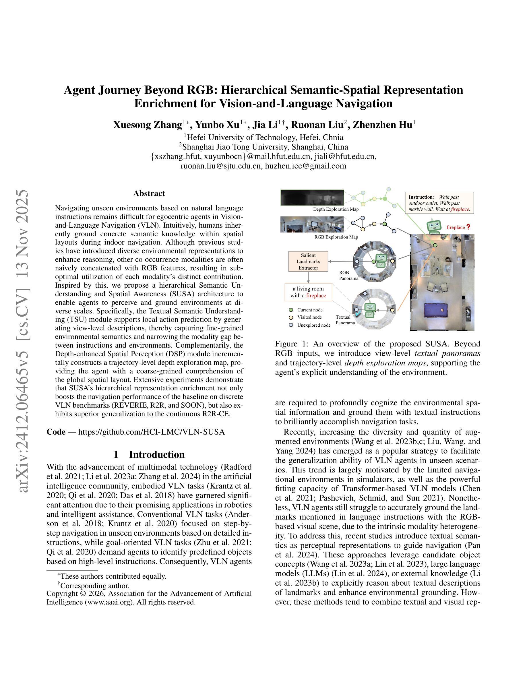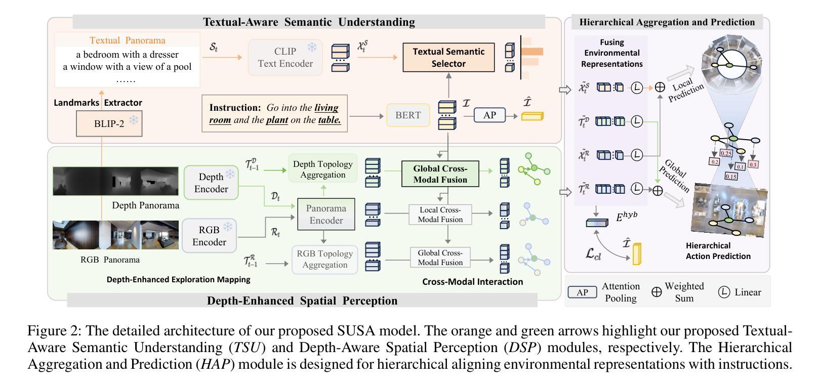 在视觉与语言导航(VLN)中,以自我为中心的智能体从自然语言指令中导航未知环境仍然是一个挑战。人类在室内导航时,自然地会在空间布局中巩固具体语义知识。尽管之前的工作已经引入了各种环境表示方法来改善推理,但辅助模式通常以原始方式与RGB特征相结合,这并没有充分利用每个模态的独特贡献。我们提出了一种分层的语义理解与空间感知(SUSA)架构,使智能体能够在多个尺度上感知和巩固环境。具体来说,文本语义理解(TSU)模块通过生成视图级别的描述来支持局部动作预测,捕捉精细语义,缩小指令和环境之间的模态差距。作为补充,深度增强空间感知(DSP)模块逐步构建轨迹级别的深度探索地图,提供全局空间布局的粗粒度表示。大量实验表明,在离散VLN基准测试(REVERIE、R2R和SOON)上,SUSA的分层次表示丰富性显著提高了导航性能,并且在连续的R2R-CE基准测试上表现更好。