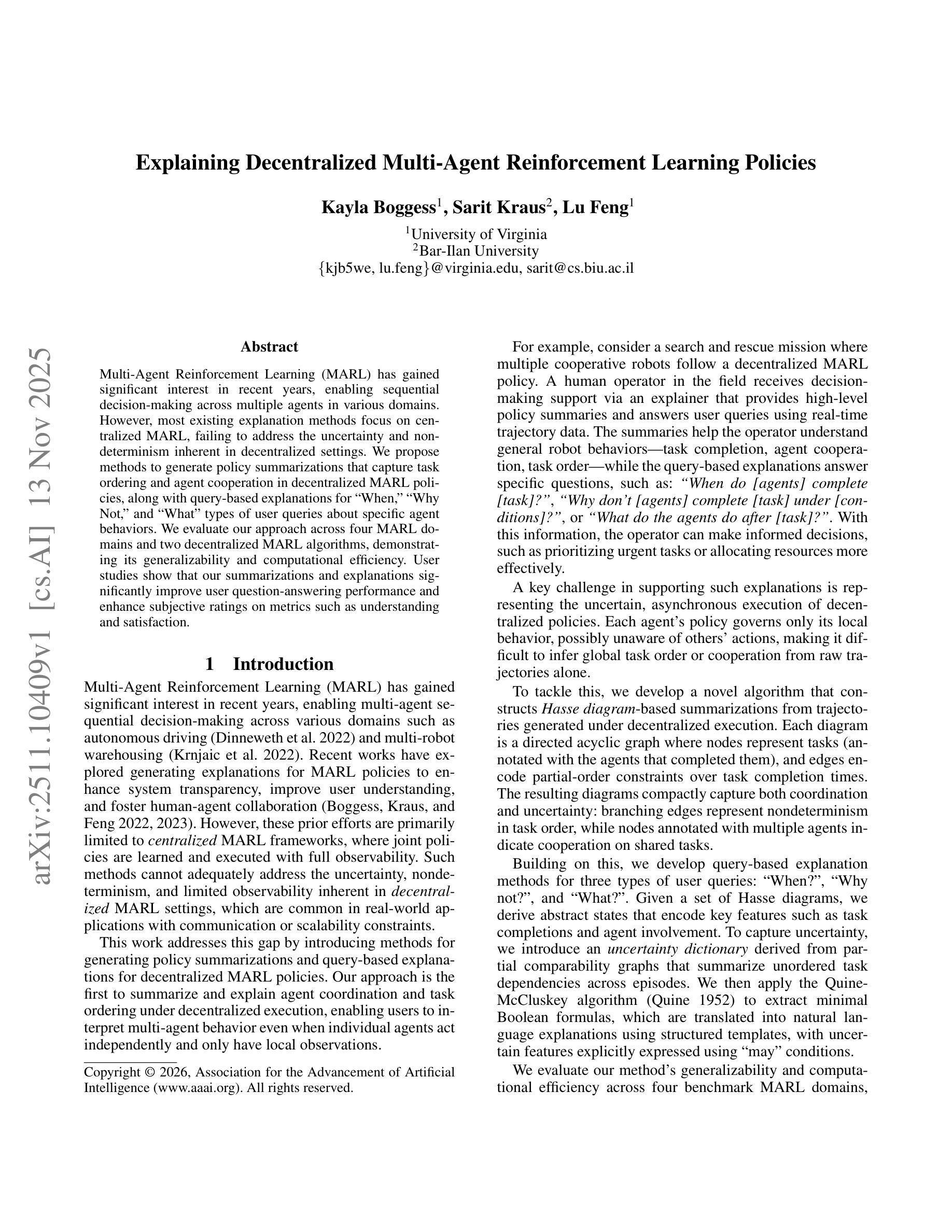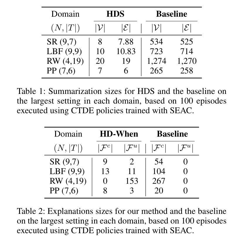多智能体强化学习(MARL)近年来备受关注,可实现多个智能体在各种领域中的序贯决策。然而,现有解释方法主要集中在集中式的MARL,无法解决去中心化设置中的不确定性和非确定性。本文提出生成策略摘要的方法,捕获去中心化MARL策略中的任务排序和智能体合作,并提供基于查询的解释,回答关于特定智能体行为的何时、何原因不、何种类型的问题。评估显示,该方法具有通用性和计算效率。用户研究表明,摘要和解释显著提高了用户的问题回答性能,并提高了理解和满意度的主观评价。