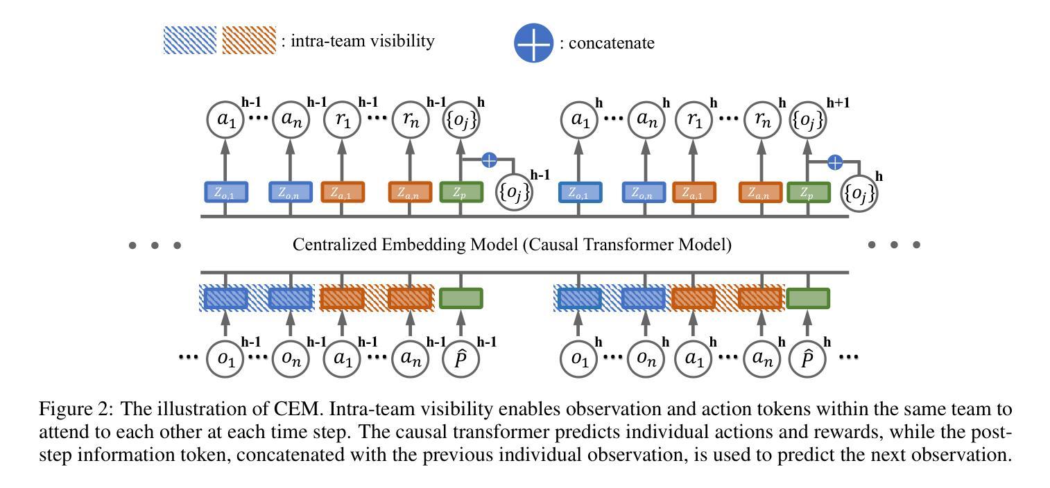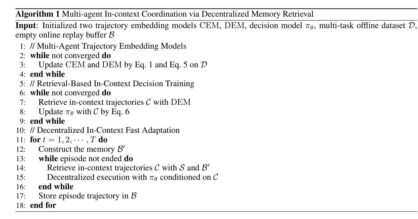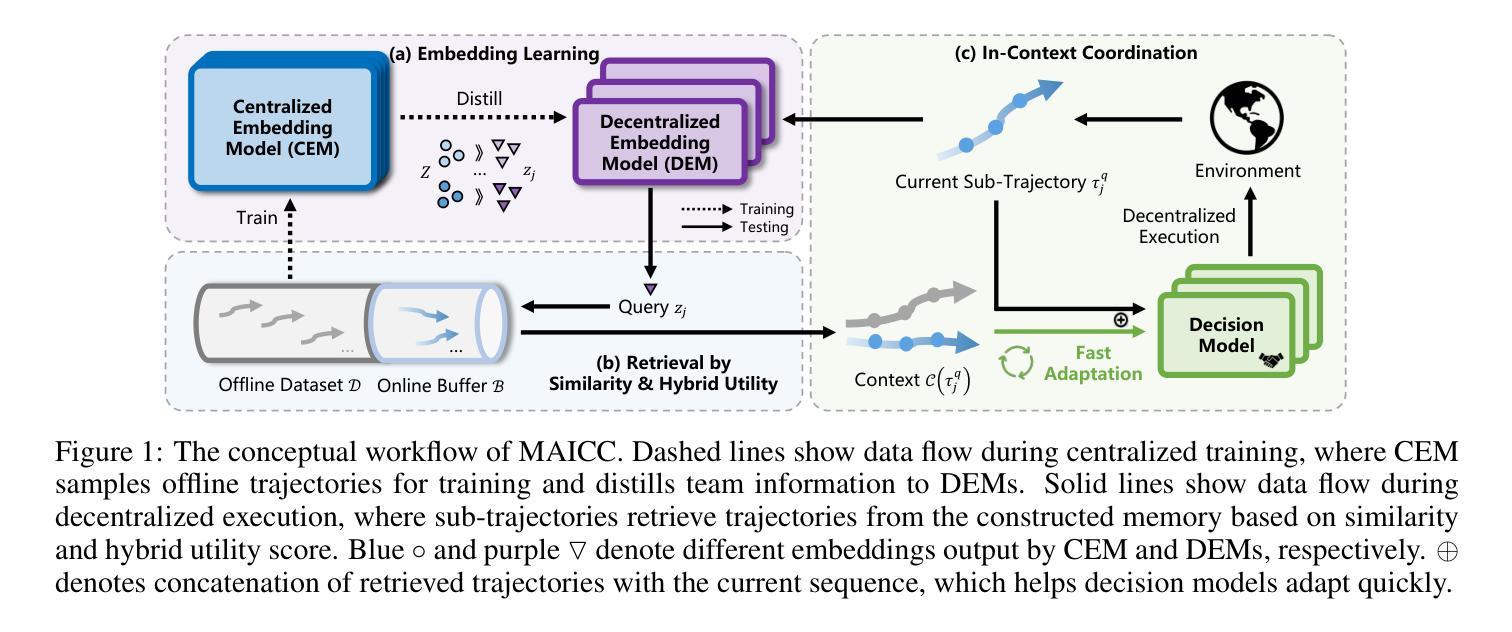 大型转换模型在多样的数据集上进行训练,展示了对未见任务的强大性能,无需参数更新。这一能力在强化学习(RL)中也得到了探索,特别是在复杂环境中,智能体通过与环境的交互来检索上下文并最大化累积奖励,表现出强大的适应性。然而,在合作型多智能体强化学习(MARL)中,智能体需要协调实现共同目标,去中心化的策略部署可能导致任务对齐和奖励分配的不匹配,限制了策略适应的效率。为解决此挑战,我们提出了基于去中心化记忆检索的多智能体上下文协调(MAICC)新方法,旨在通过快速适应增强协调性。该方法包括训练中央嵌入模型以捕获精细轨迹表示,随后使用去中心化模型近似中央模型以获得团队级任务信息。基于学习的嵌入,我们检索相关的轨迹作为上下文,与智能体的当前子轨迹相结合,为决策提供依据。在去中心化执行过程中,我们引入了新的记忆机制,有效平衡了在线数据与离线记忆。基于构建的记忆,我们提出了一个混合效用分数,既包括个体也包括团队回报,确保智能体之间的信用分配。在合作型MARL基准测试上进行的广泛实验显示,MAICC使智能体在未见任务上的适应能力得到了提高。代码已在GitHub上发布。