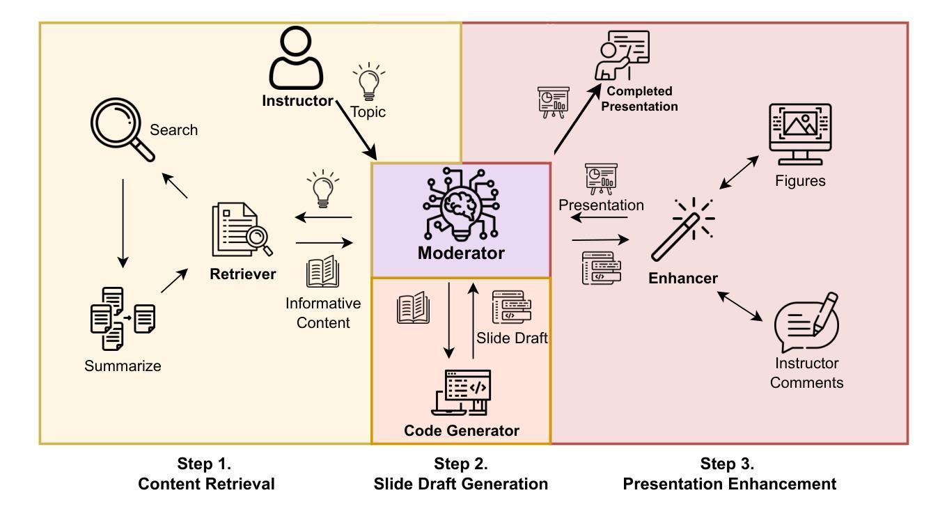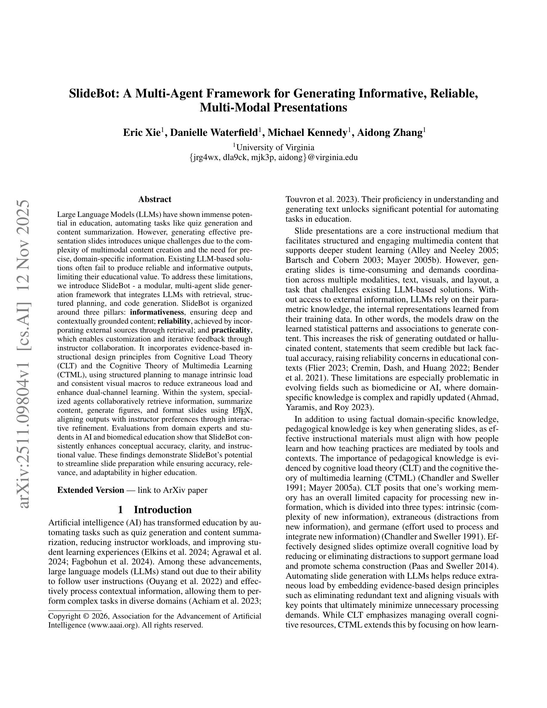 大型语言模型(LLMs)在教育领域展现出巨大的潜力,能够自动化生成测验和内容摘要等任务。然而,生成有效的演示幻灯片由于多媒体内容创作的复杂性和对精确、特定领域信息的需求,引入了一些独特的挑战。现有的基于LLM的解决方案往往无法产生可靠和富有信息量的输出,从而限制了其教育价值。为了解决这些限制,我们引入了SlideBot——一个模块化的多代理幻灯片生成框架,它将LLMs与检索、结构化规划和代码生成相结合。SlideBot围绕三个支柱构建:信息性,确保深入和基于上下文的内容;可靠性,通过检索融入外部资源来实现;实用性,通过教师协作实现定制和迭代反馈。它结合了认知负荷理论(CLT)和多媒体学习认知理论(CTML)的证据支持教学设计原则,使用结构化规划来管理内在负荷,并用一致的视觉宏元素来减少外在负荷并增强双通道学习。在该系统中,专业代理协同检索信息、总结内容、生成图形并使用LaTeX格式化幻灯片,通过交互细化与教师的偏好对齐输出。来自人工智能和生物医学教育领域的专家和学生评估表明,SlideBot持续提高了概念准确性、清晰度和教学价值。这些发现证明了SlideBot在简化幻灯片制作的同时,确保准确性、相关性和适应性的潜力,在高等教育中具有广泛的应用前景。