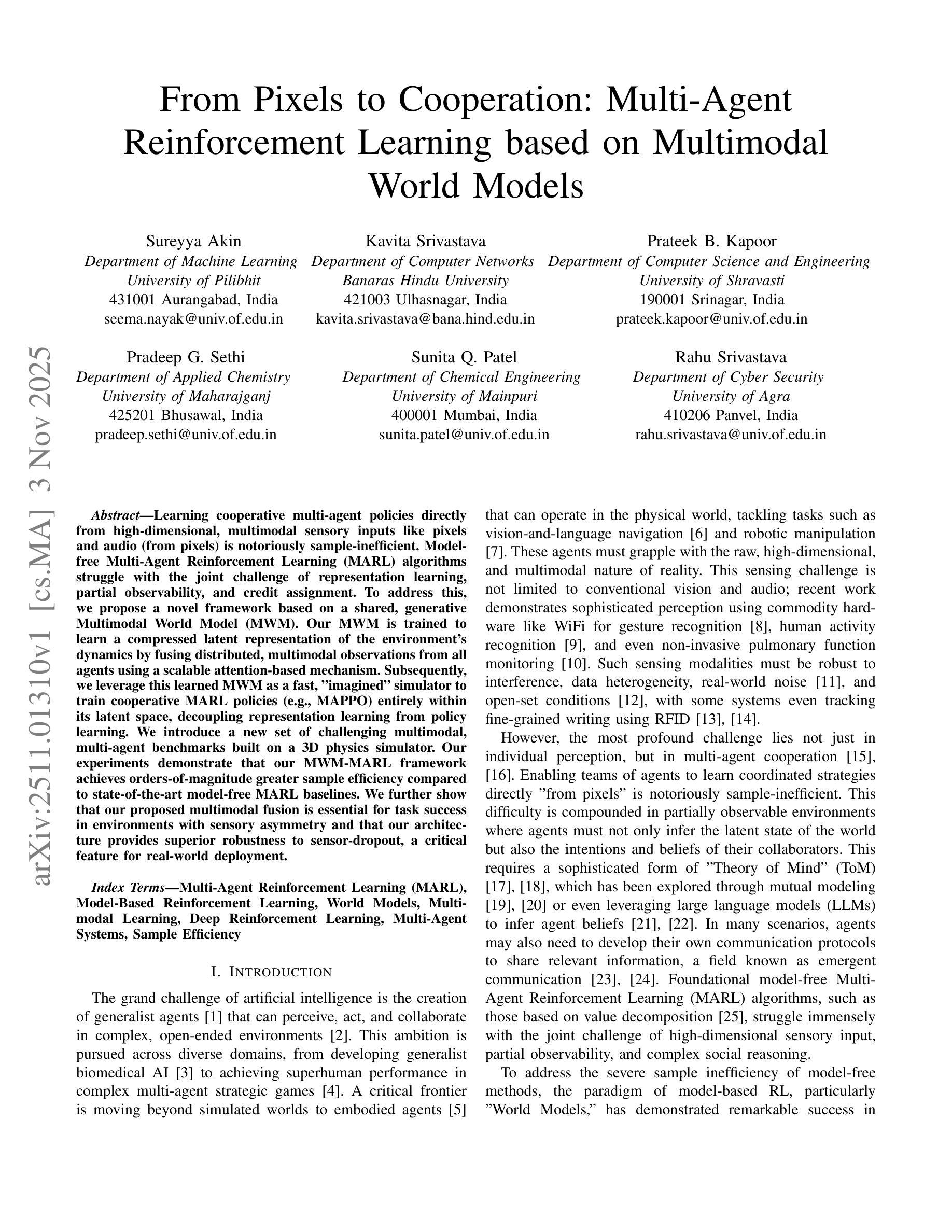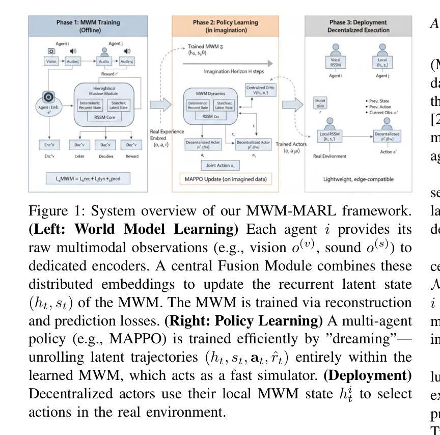 基于像素和音频等多元感官输入,学习多智能体合作策略的挑战在于样本效率低。针对此问题,我们提出一种新型框架,利用共享生成式多模态世界模型(MWM)。MWM训练得到环境的压缩潜在表现,通过可扩展的注意力机制融合所有智能体的分布式多模态观察。随后,我们在MWM中学习合作多智能体强化学习政策(如MAPPO),完全脱离其潜在空间,使表现学习和政策学习解耦。实验表明,我们的MWM-MARL框架相较于当前先进的无模型MARL基准测试,样本效率提高了数倍。此外,我们证明在感官不对称的环境中,提出的多模态融合对任务成功至关重要,并且我们的架构对传感器掉线具有出色的稳健性,这是实现真实世界部署的关键特性。