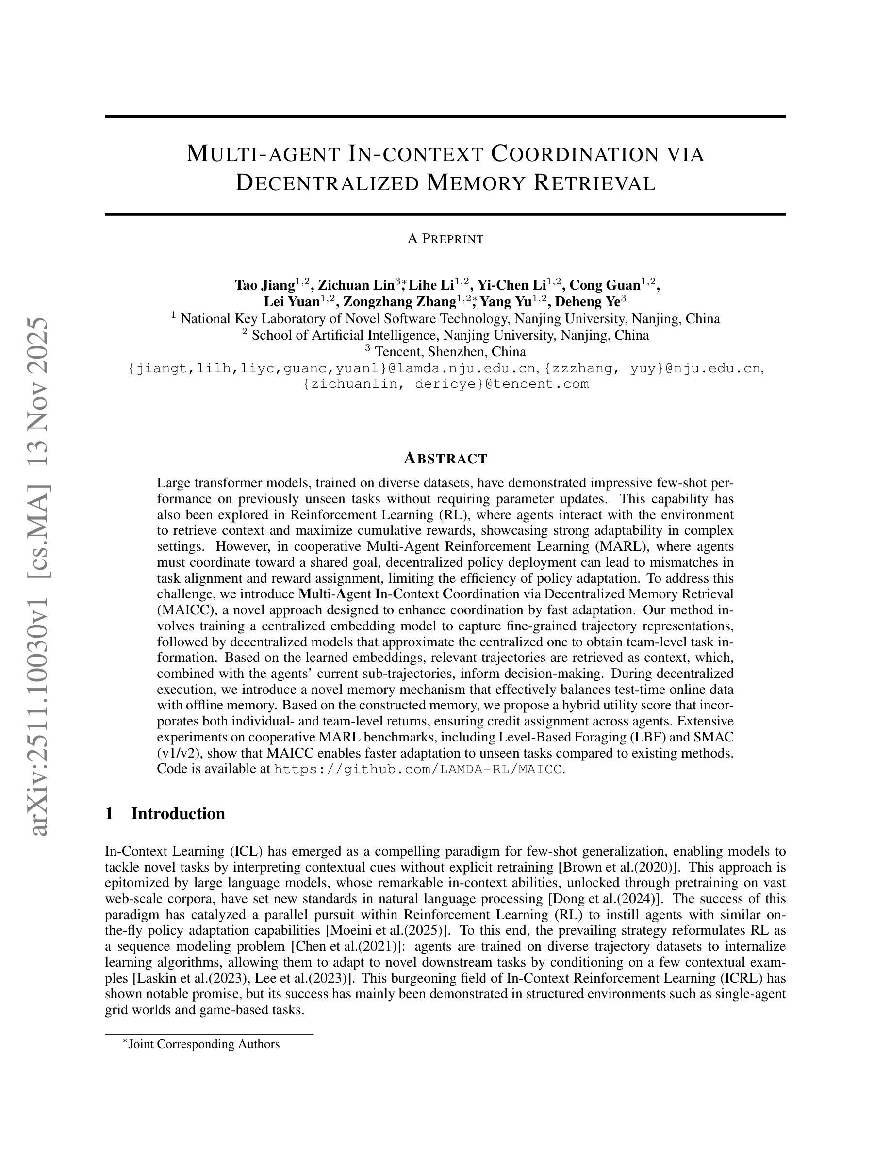 Large transformer models, trained on diverse datasets, have demonstrated impressive few-shot performance on previously unseen tasks without requiring parameter updates. This capability has also been explored in Reinforcement Learning (RL), where agents interact with the environment to retrieve context and maximize cumulative rewards, showcasing strong adaptability in complex settings. However, in cooperative Multi-Agent Reinforcement Learning (MARL), where agents must coordinate toward a shared goal, decentralized policy deployment can lead to mismatches in task alignment and reward assignment, limiting the efficiency of policy adaptation. To address this challenge, we introduce Multi-agent In-context Coordination via Decentralized Memory Retrieval (MAICC), a novel approach designed to enhance coordination by fast adaptation. Our method involves training a centralized embedding model to capture fine-grained trajectory representations, followed by decentralized models that approximate the centralized one to obtain team-level task information. Based on the learned embeddings, relevant trajectories are retrieved as context, which, combined with the agents’ current sub-trajectories, inform decision-making. During decentralized execution, we introduce a novel memory mechanism that effectively balances test-time online data with offline memory. Based on the constructed memory, we propose a hybrid utility score that incorporates both individual- and team-level returns, ensuring credit assignment across agents. Extensive experiments on cooperative MARL benchmarks, including Level-Based Foraging (LBF) and SMAC (v1/v2), show that MAICC enables faster adaptation to unseen tasks compared to existing methods. Code is available at https://github.com/LAMDA-RL/MAICC.