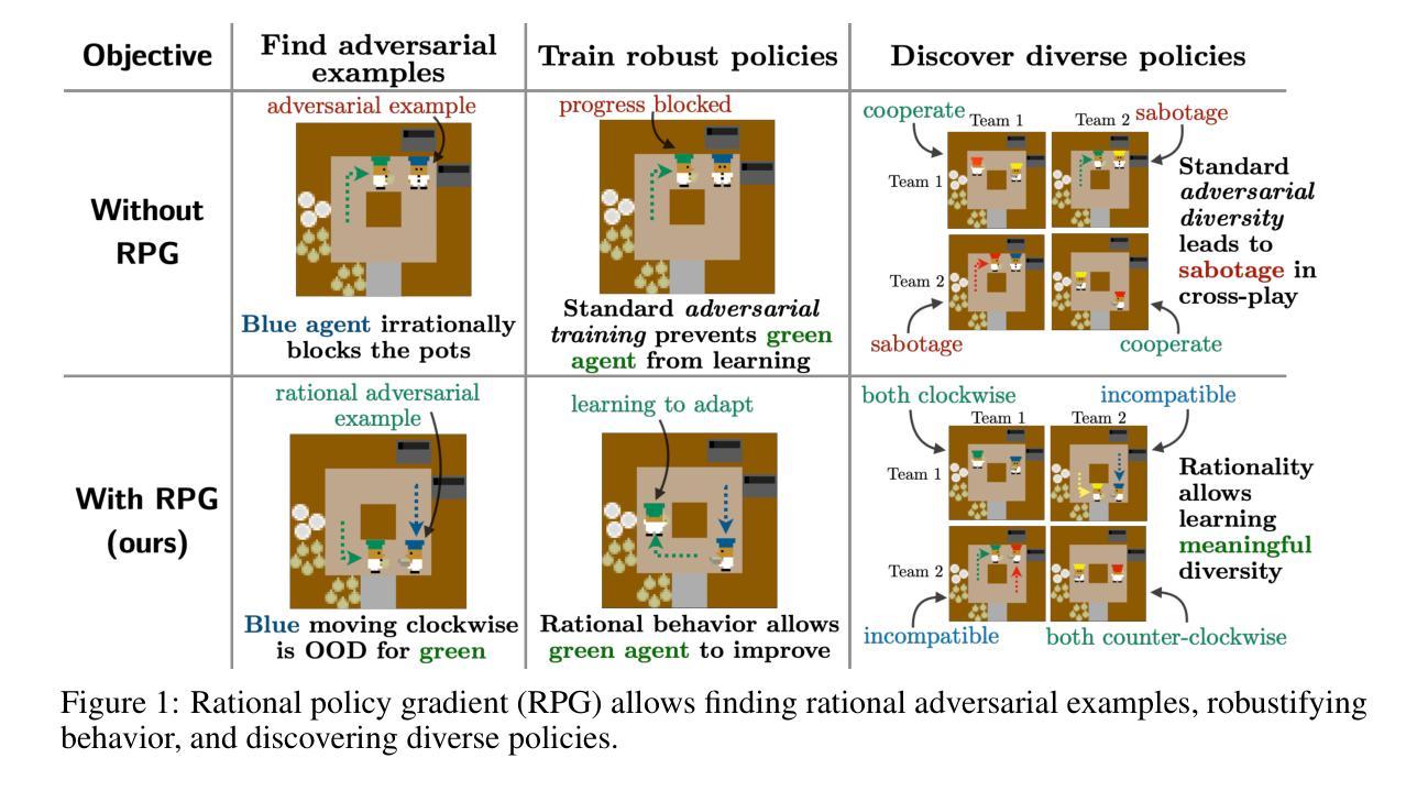 对抗性优化算法通过寻找智能体策略的缺陷,已成功应用于多智能体环境中寻找稳健和多样化的策略。然而,对抗性优化的成功主要局限于零和环境中,因为其在合作环境中的直接应用会导致关键失败模式——智能体受到非理性激励去自我破坏,阻止任务完成并阻止进一步学习。为解决这一问题,我们提出了理性策略优化(RPO),这是一种对抗性优化的形式化方法,通过确保智能体保持理性避免自我破坏——即其策略对于可能的对手策略来说是最佳的。为解决RPO问题,我们发展了理性策略梯度法(RPG),它通过训练智能体以最大化其自身奖励于原始游戏的一种改进版本中实现优化对抗目标的目标。RPG使我们能够扩展各种现有的对抗性优化算法,不再受制于自我破坏的限制,可以发现对抗性例子,提高稳健性和适应性,并学习多样化的策略。我们在多个流行的合作和通用环境中的表现进行了实证验证。欢迎访问我们的项目页面:https://rational-policy-gradient.github.io 了解更多。