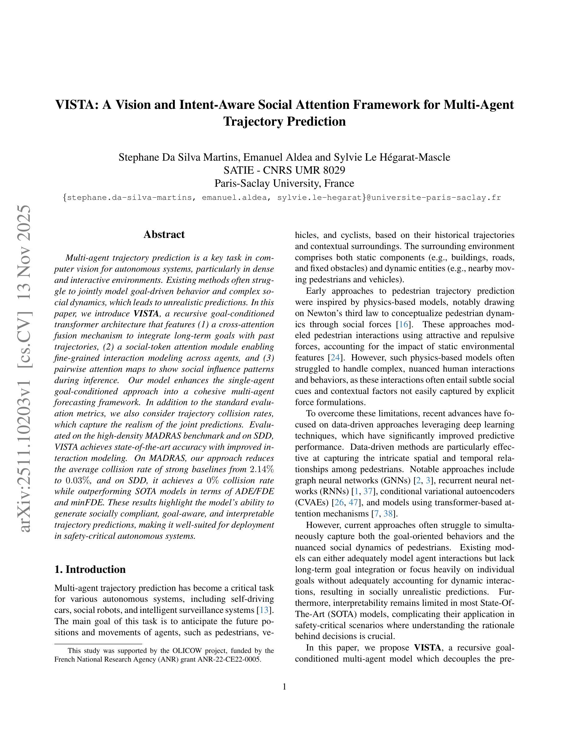 多代理轨迹预测对于在密集、交互环境中运行自主系统至关重要。现有方法往往无法联合捕获代理的长期目标和精细的社会互动,导致未来多代理轨迹预测不真实。本文提出VISTA,一种用于多代理轨迹预测的递归目标条件变压器。VISTA结合了跨注意力融合模块,将长期意图与过去动作相结合,采用社交令牌注意力机制进行灵活的跨代理交互建模,以及配对注意力图,可在推理时解释社会影响模式。该模型将单目标条件预测转化为连贯的多代理预测框架。除了标准位移指标外,我们还以轨迹碰撞率作为联合现实性的衡量指标。在密集代理数据集MADRAS和SDD上,VISTA达到最先进的精度,碰撞次数大大减少。在MADRAS上,它将基线模型的平均碰撞率从2.14%降至0.03%,在SDD上实现了零碰撞,同时提高了ADE、FDE和minFDE。这些结果表明,VISTA生成的轨迹具有社会合规性、目标意识和可解释性,对于安全关键的自主系统具有广阔的发展前景。