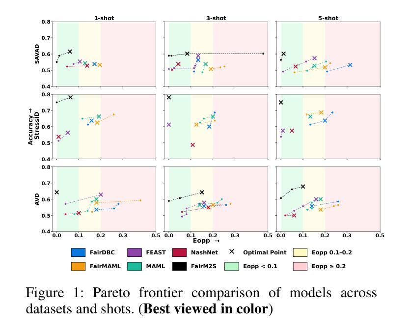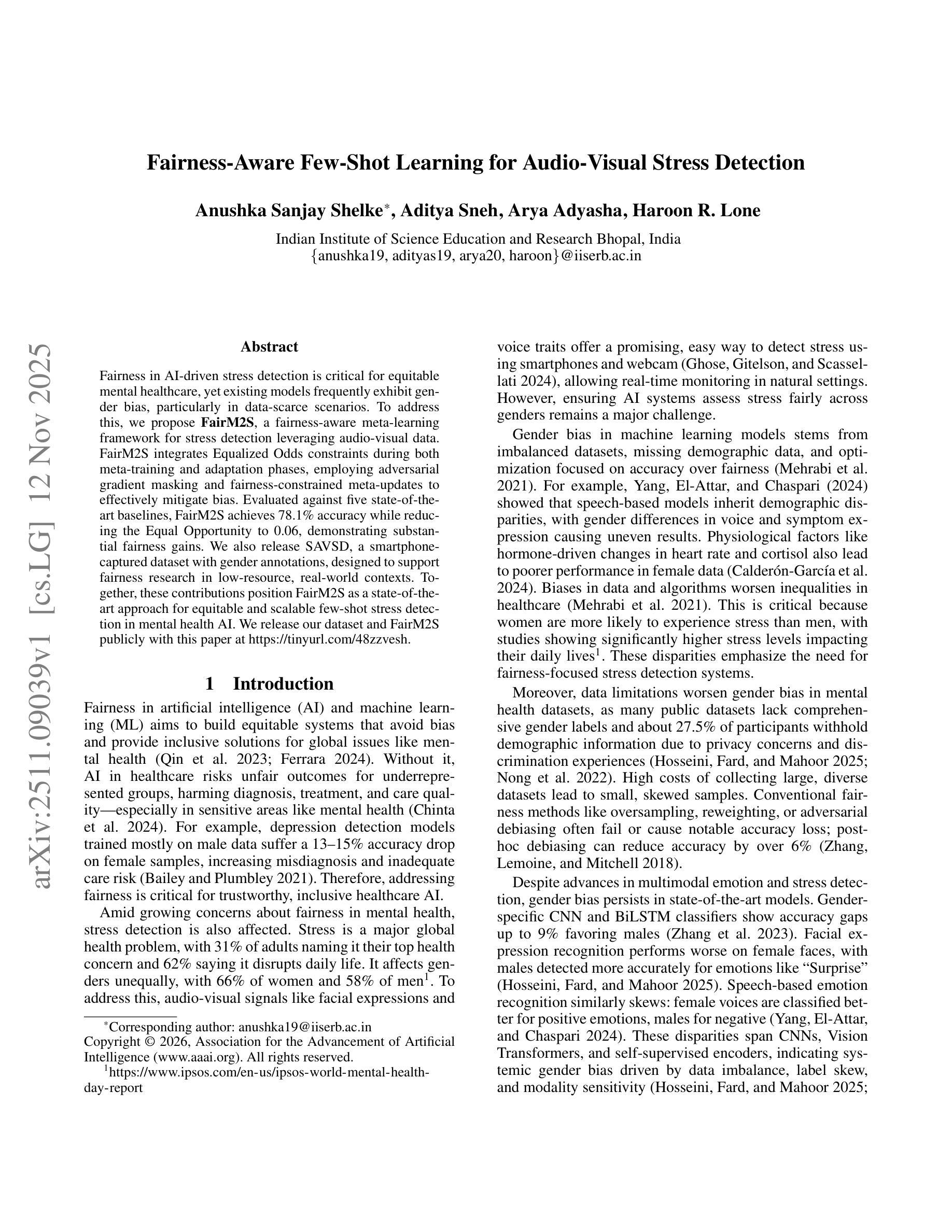 人工智能驱动的应激检测中的公平性对于公平的心理健康护理至关重要,然而现有的模型经常表现出性别偏见,特别是在数据稀缺的情况下。为了解决这个问题,我们提出了FairM2S,这是一个利用视听数据的应激检测公平性感知元学习框架。FairM2S在元训练和适应阶段都整合了均衡机会约束,采用对抗性梯度掩蔽和公平性约束元更新来有效减轻偏见。与五种最先进的基线相比,FairM2S达到了78.1%的准确率,同时将平等机会降低到0.06,显示出实质性的公平收益。我们还发布了SAVSD,这是一个带有性别注释的智能手机捕捉数据集,旨在支持低资源、现实环境中的公平性研究。这些贡献共同将FairM2S定位为心理健康人工智能中公平且可扩展的少量应激检测的最先进方法。我们随这篇论文公开发布我们的数据集和FairM2S。