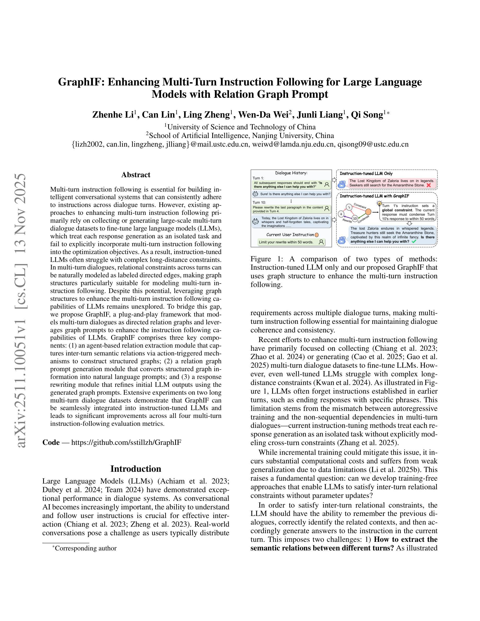 本文强调在构建智能对话系统时,多轮指令跟随的重要性。现有方法主要通过收集或生成大规模多轮对话数据集来微调大型语言模型(LLMs),但它们未能显式地将多轮指令跟随纳入优化目标。因此,提出GraphIF框架,将多轮对话建模为有向关系图,并利用图提示增强LLMs的指令跟随能力。该框架包括三个关键组件,并通过实验证明其可无缝集成到指令调整过的LLMs中,并在所有四项多轮指令跟踪评估指标上实现显著改进。