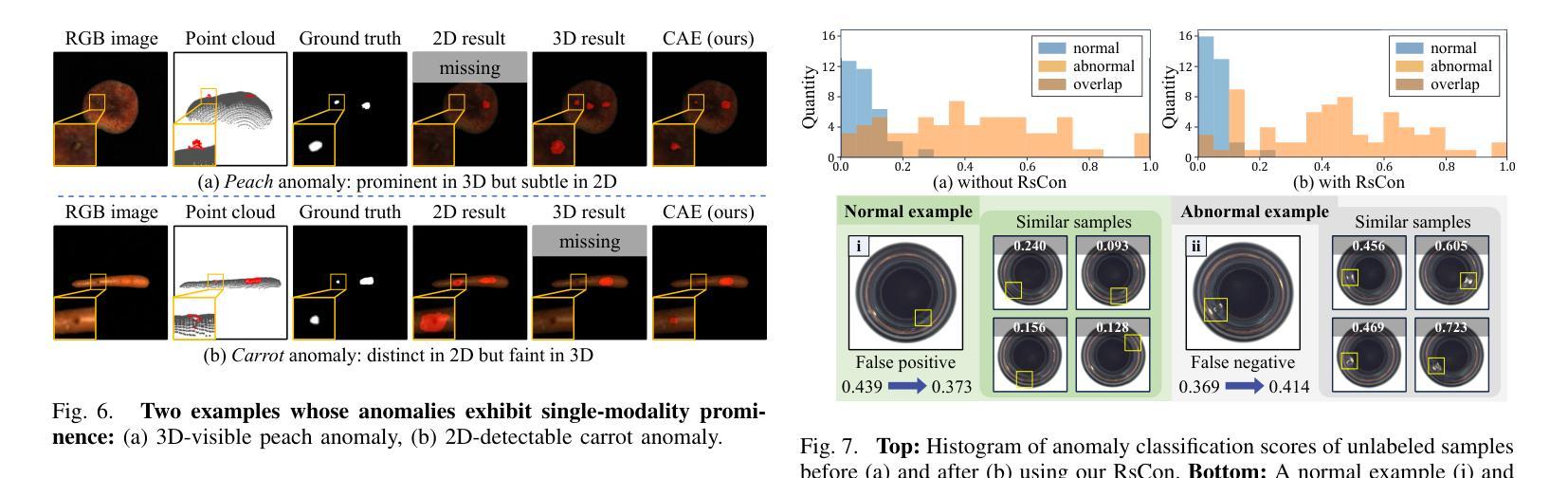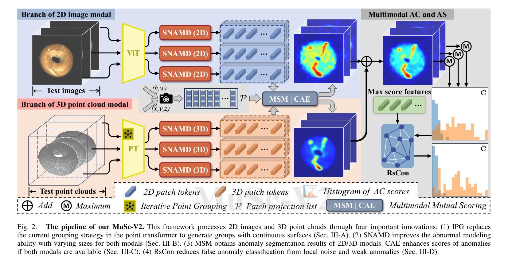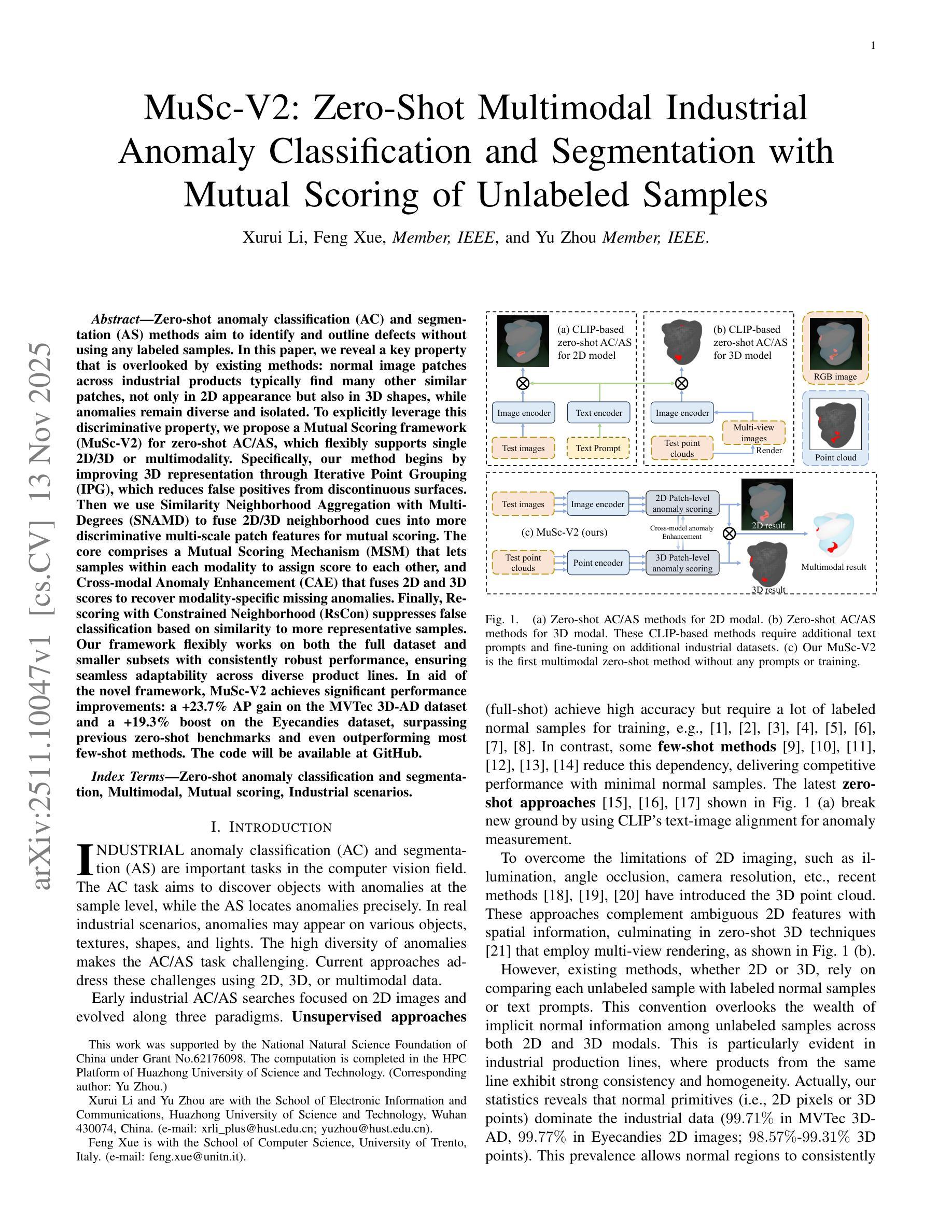 零样本异常分类(AC)和分割(AS)方法旨在不使用任何标记样本来识别和描述缺陷。本文揭示了现有方法忽略的关键属性:工业产品中的正常图像斑块通常可以找到许多其他相似的斑块,不仅在二维外观上,而且在三维形状上,而异常值仍然多样且孤立。为了明确利用这种判别属性,我们提出了用于零样本AC/AS的MuSc-V2框架,该框架灵活支持单模态的二维/三维或多模态。具体来说,我们的方法首先通过迭代点分组(IPG)改进三维表示,从而减少来自不连续表面的误报。然后,我们使用具有多度的相似性邻域聚合(SNAMD)来融合二维/三维邻域线索,以生成更具判别力的多尺度斑块特征来进行相互评分。核心部分包括相互评分机制(MSM),它允许每个模态内的样本相互评分,以及跨模态异常增强(CAE),它融合了二维和三维分数来恢复特定模态缺失的异常值。最后,通过约束邻域进行再次评分(RsCon)抑制了基于与更具代表性样本相似性的误分类。我们的框架在完整数据集和小子集上都能灵活工作,具有持续稳定的性能,确保在不同产品线之间无缝适应。借助新型框架MuSc-V2实现了显著的性能提升:在MVTec 3D-AD数据集上提高了+23.7%的AP值,在Eyecandies数据集上提高了+19.3%的性能,超越了之前的零样本基准测试,甚至超越了大多数小样方法。代码将在https://github.com/HUST-SLOW/MuSc-V2上提供。