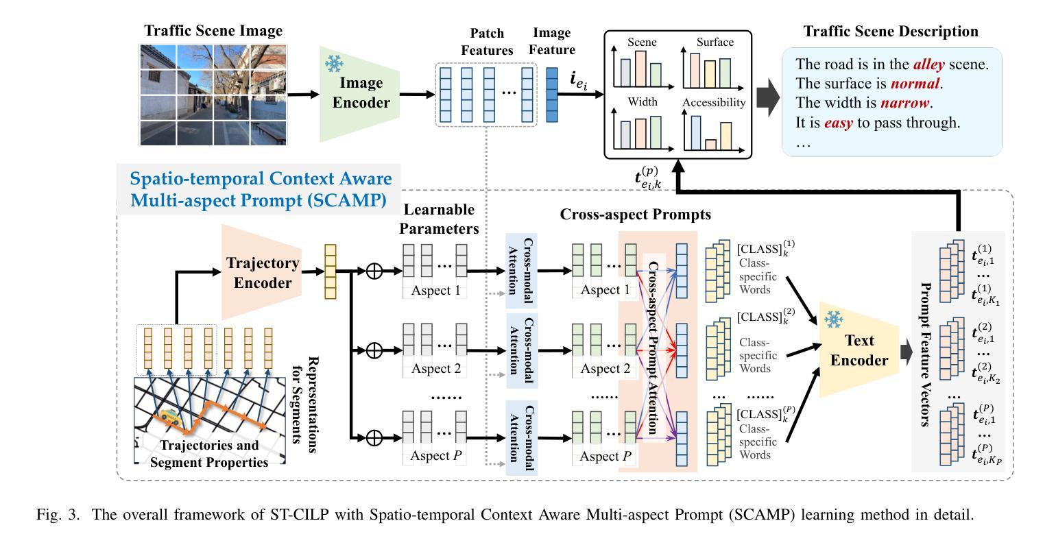 如今,导航和拼车应用程序已经收集了大量带有时空数据的图像。分析这些与时空信息相关的图像的核心技术是交通场景理解(TSU),旨在提供对交通场景的综合描述。与传统的时空数据分析任务不同,TSU任务既依赖于时空数据,又依赖于视觉文本数据,这带来了独特的挑战。然而,最近的研究往往将TSU视为常见的图像理解任务,忽略了时空信息,并忽视了交通场景不同方面的相互关系。为了解决这些问题,我们提出了一种基于CILP的新型时空增强模型(ST-CLIP)用于TSU。我们的模型以经典的视觉语言模型CLIP作为骨干网,并设计了一种时空上下文感知多方面提示(SCAMP)学习方法,将时空信息融入TSU中。提示学习方法由两个组件组成:一个动态时空上下文表示模块,用于提取每个交通场景图像的时空数据表示向量;一个两级ST感知多方面提示学习模块,将ST上下文表示向量集成到CLIP模型的提示词嵌入中。第二个模块还提取低级视觉特征和图像级高级语义特征,以利用交通场景不同方面的交互关系。据我们所知,这是首次尝试将时空信息整合到视觉语言模型中,以促进TSU任务。在两个真实世界数据集上的实验表明,在复杂场景理解场景中采用小样本学习策略时,其性能优越。