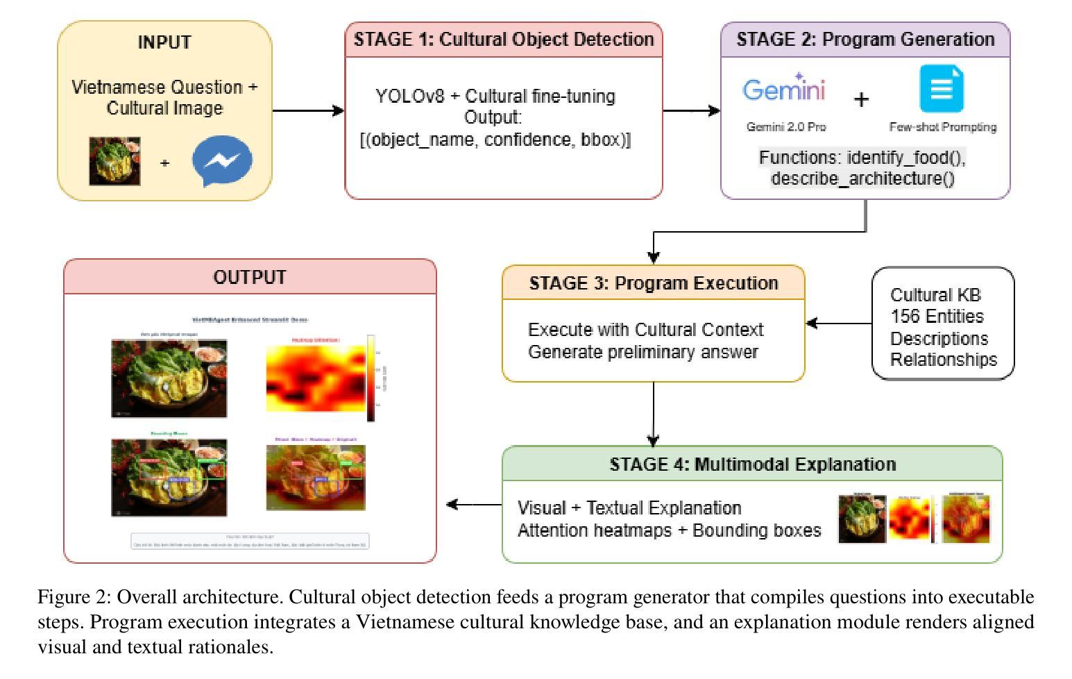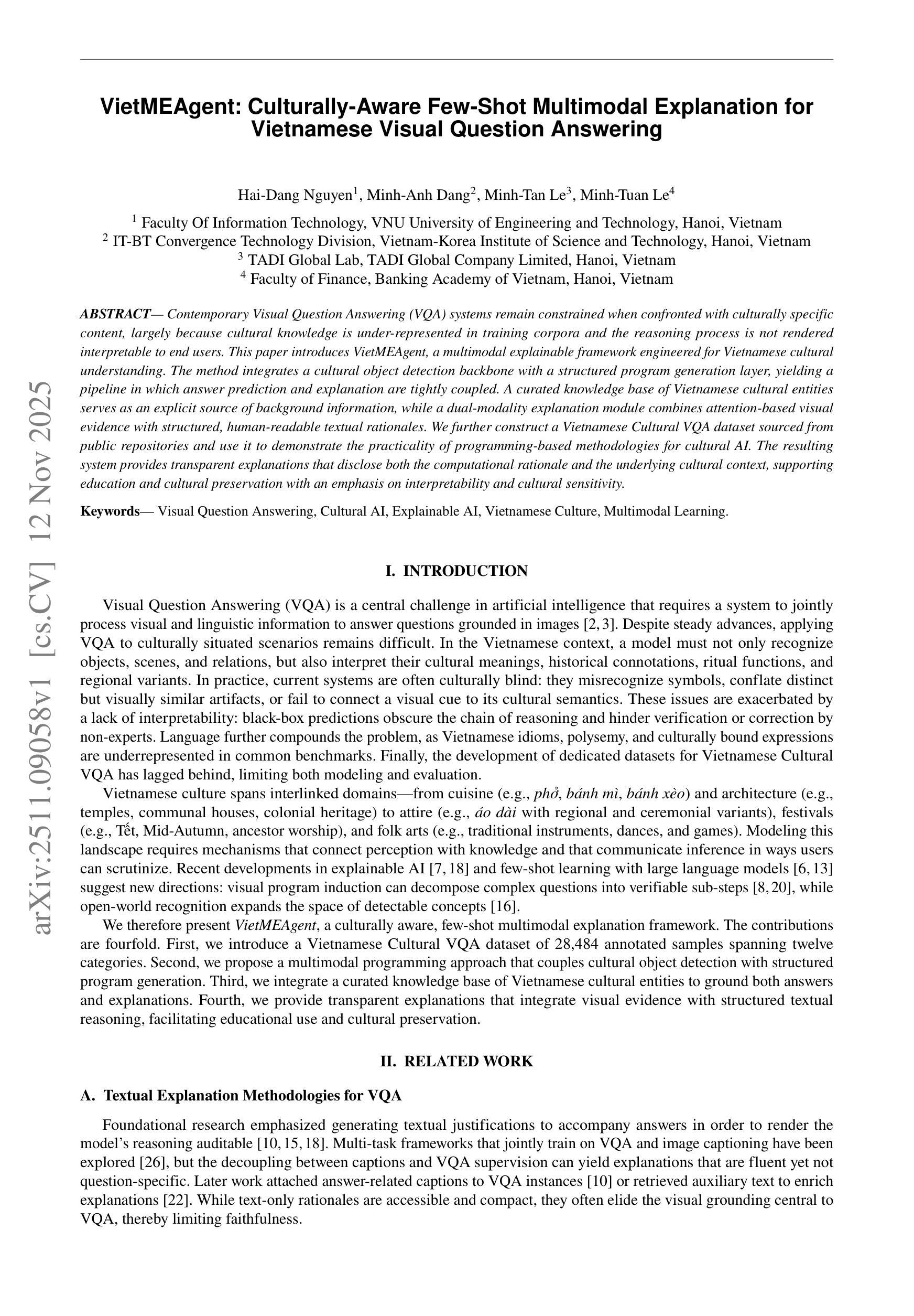 现代视觉问答(VQA)系统在面对文化特定内容时仍受到诸多限制,这主要是因为训练语料库中的文化知识储备不足,且推理过程无法向最终用户解释。本文介绍了VietMEAgent,这是一种针对越南文化理解的多模式可解释框架。该方法将文化对象检测骨干与结构化程序生成层相结合,形成了一个紧密耦合的答案预测和解释管道。越南文化实体的精选知识库作为背景信息的明确来源,而双模式解释模块则结合了基于注意力的视觉证据与结构化、可读的文本理由。我们还从公共存储库中构建了越南文化VQA数据集,并用它来证明基于编程的文化人工智能方法的实用性。该系统提供透明的解释,既揭示计算推理又揭示潜在的文化背景,强调可解释性和文化敏感性,支持教育和文化保护。