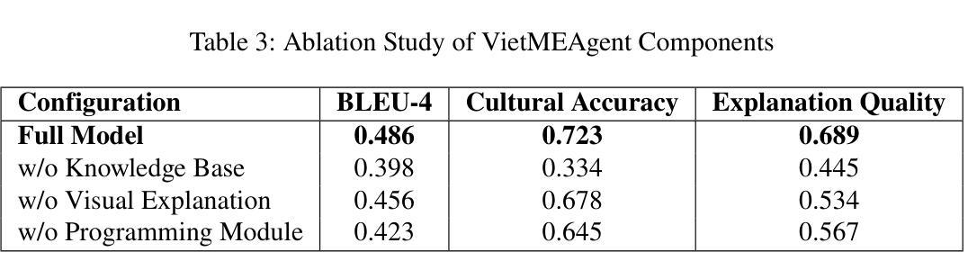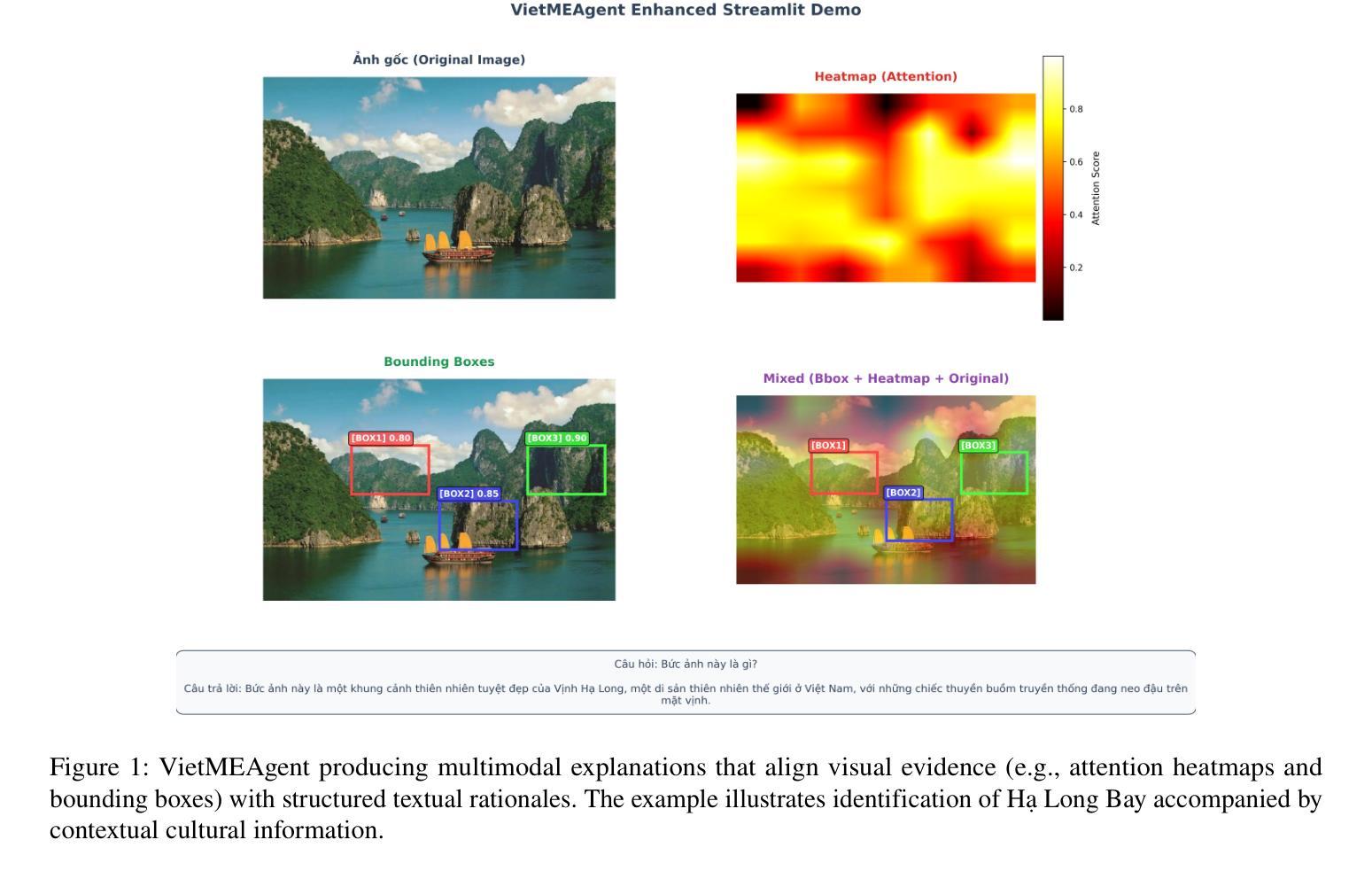 本文介绍了VietMEAgent,这是一个为越南文化理解设计的多模态可解释框架。它通过整合文化对象检测主干与结构化程序生成层,建立一个紧密耦合的答案预测和解释管道。使用越南文化实体的精选知识库作为背景信息的明确来源,同时结合基于注意力的视觉证据和结构化、可读的文本解释,构成双模态解释模块。此外,从公共仓库构建越南文化VQA数据集,演示基于编程的文化AI的实用性。该系统提供透明的解释,既揭示计算原理又展现文化背景,支持教育与文化保育,并强调可解释性和文化敏感性。