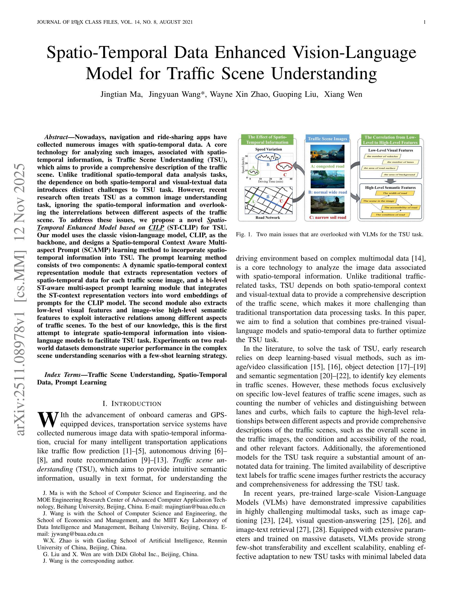 基于时空增强模型的交通场景理解研究旨在通过结合时空信息和视觉语言模型(CLIP)来理解交通场景。该研究通过设计时空上下文感知多方面提示学习方法(SCAMP),将时空数据融入交通场景理解(TSU)。实验证明,在复杂场景理解场景中,采用少量学习策略的该模型表现出卓越性能。