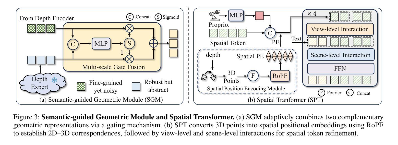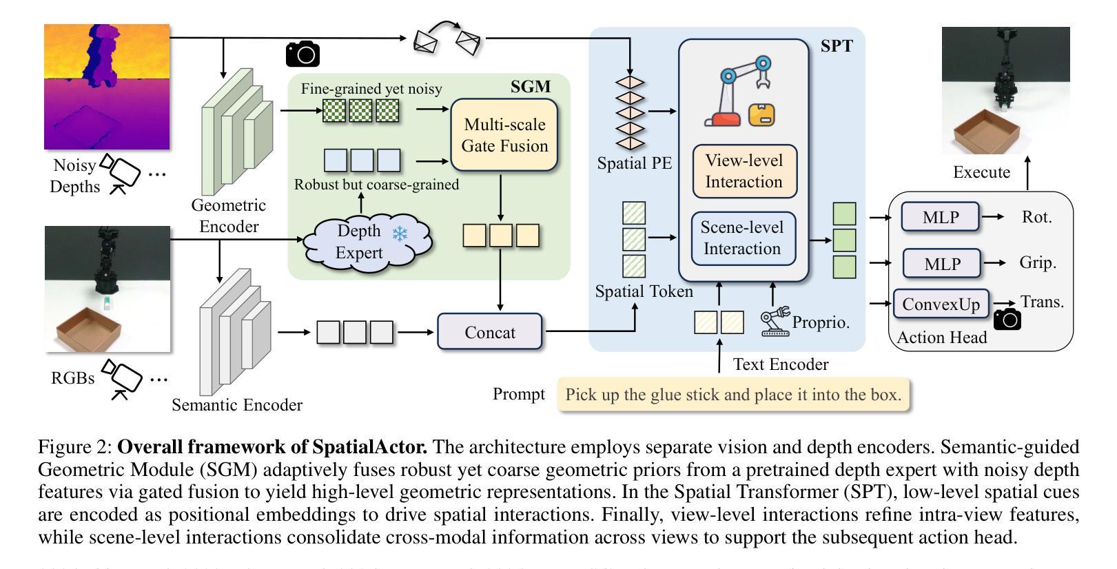 机器人操作需要对现实世界中的物体进行精确的空间理解。基于点的方法受到稀疏采样的困扰,导致精细语义的丢失。基于图像的方法通常将RGB和深度信息输入到预训练于3D辅助任务的2D骨干网络上,但它们的语义和几何纠缠对现实世界中的固有深度噪声敏感,这破坏了语义理解。此外,这些方法关注高级几何,却忽视了对精确交互至关重要的低级空间线索。我们提出了SpatialActor,这是一个用于稳健机器人操作的解耦框架,它明确地分离了语义和几何。语义引导几何模块自适应地融合来自嘈杂深度和语义引导专家先验的两种互补几何。此外,空间转换器利用低级空间线索进行准确的2D-3D映射,并实现空间特征之间的交互。我们在50多个任务的多个仿真和真实场景中对SpatialActor进行了评估。它在RLBench上达到了最先进的性能,达到87.4%,并在不同的噪声条件下提高了13.9%至19.4%,显示出强大的稳健性。此外,它大大增强了对新任务的少量样本泛化能力,并在各种空间扰动下保持稳健性。项目页面:https://shihao1895.github.io/SpatialActor